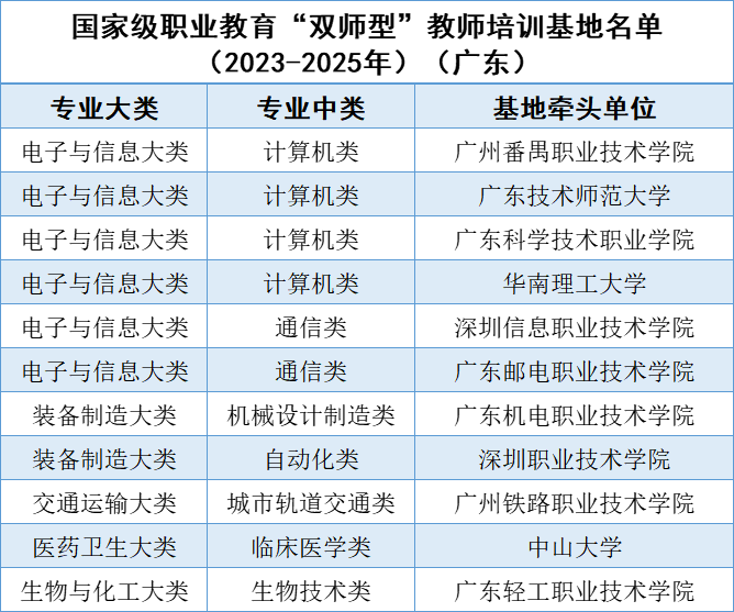 日前,教育部印发通知,公布国家级职业教育“双师型”教师培训基地(2023—2025年)(以下简称职教国培基地)。其中,广东共有11所高校入选。