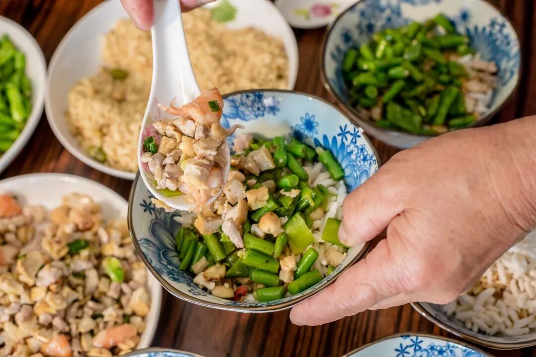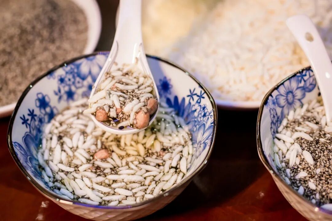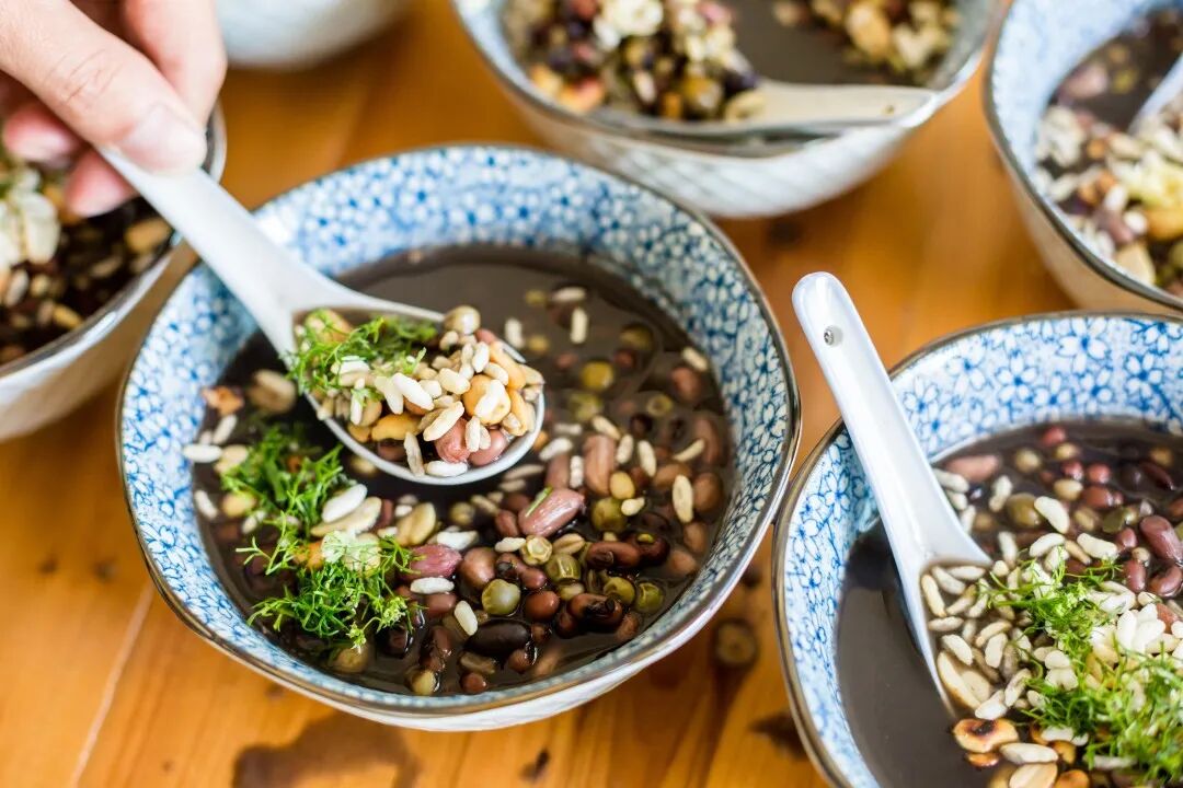平原片区擂茶大多从各地带入,取材和制作方法也不一样,在保持原有茶叶、芝麻、花生米和爆米花和时蔬青菜等食材外,从养生的角度和客人的需求,在食材上添加黑豆(俗称豆仔茶)、薄荷、艾叶、紫苏、相思藤叶、苦刺头叶、穿心连等药用植物的嫩叶进行制作,有扶阳利湿、解热祛暑、清甜滋润、滋阴润肺,健牌养胃之功效,