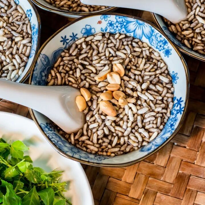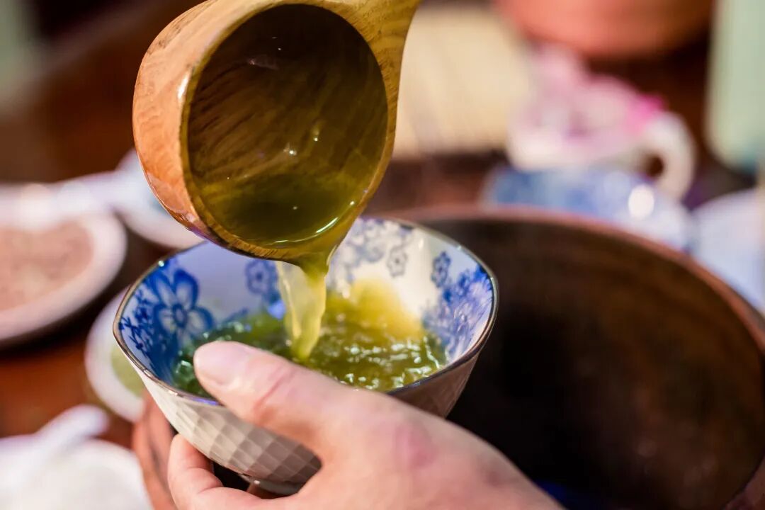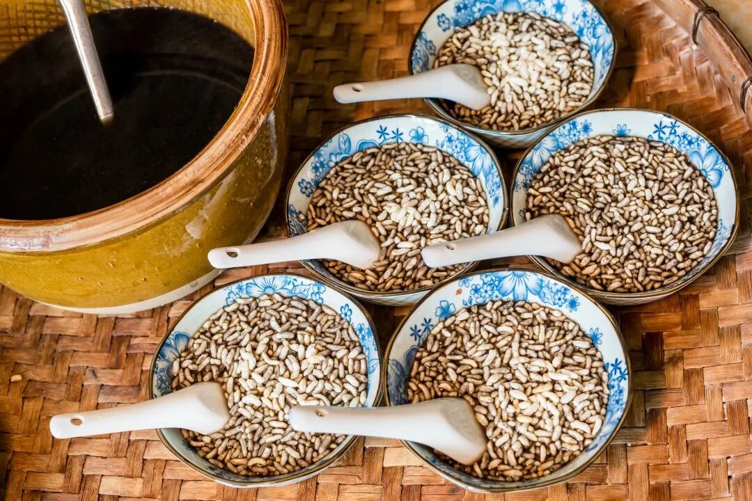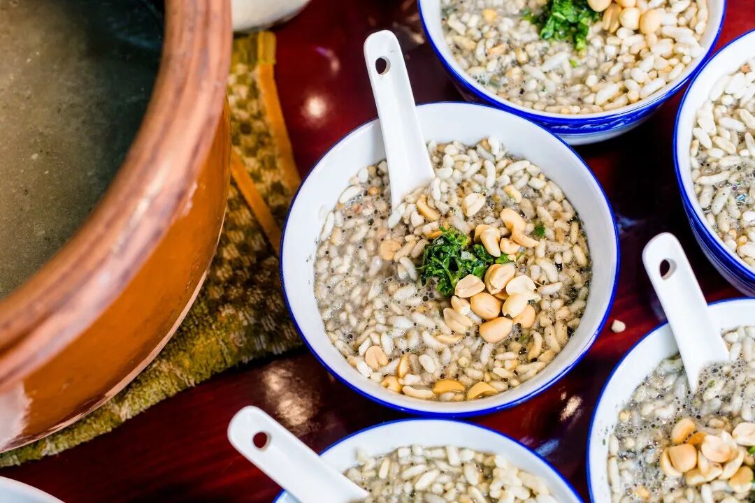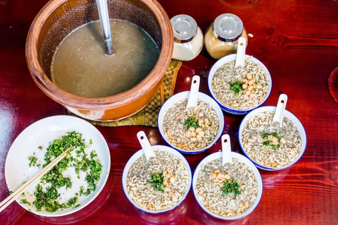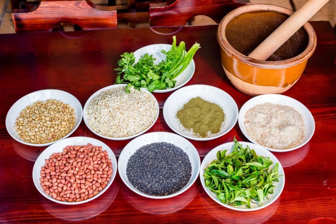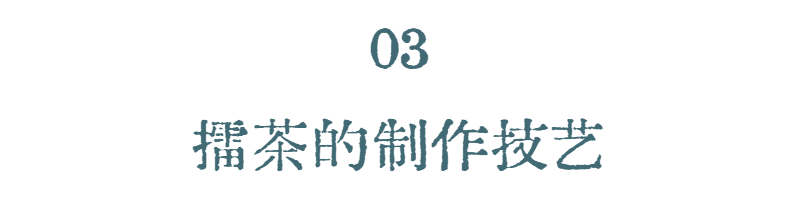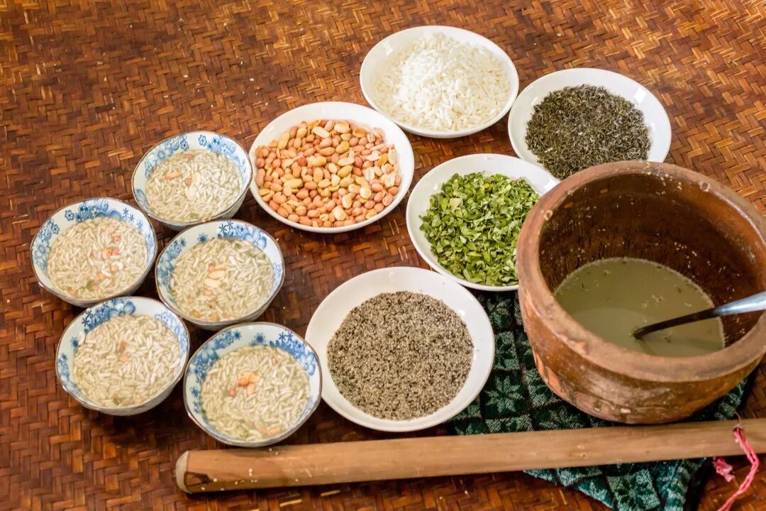 山区片区擂茶取材主要以新鲜茶、熟芝麻、花生米再加少许的盐用特制的擂钵(俗称牙钵)擂成糊状,加入开水即可。食用时再加入少许花生米和爆米花(俗称炒米),既可充饥,也可解渴。