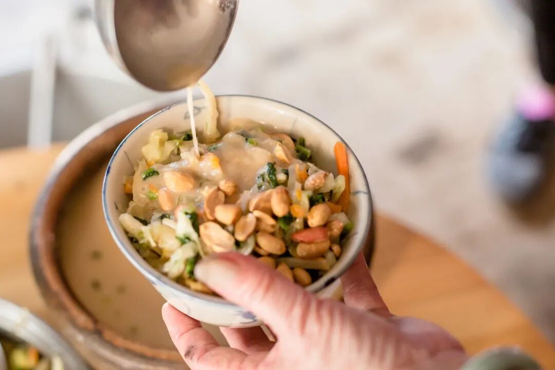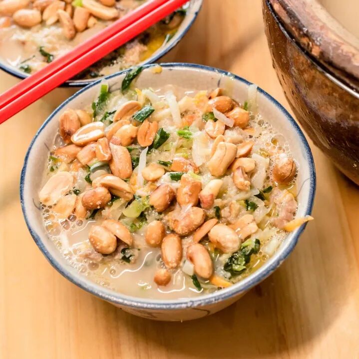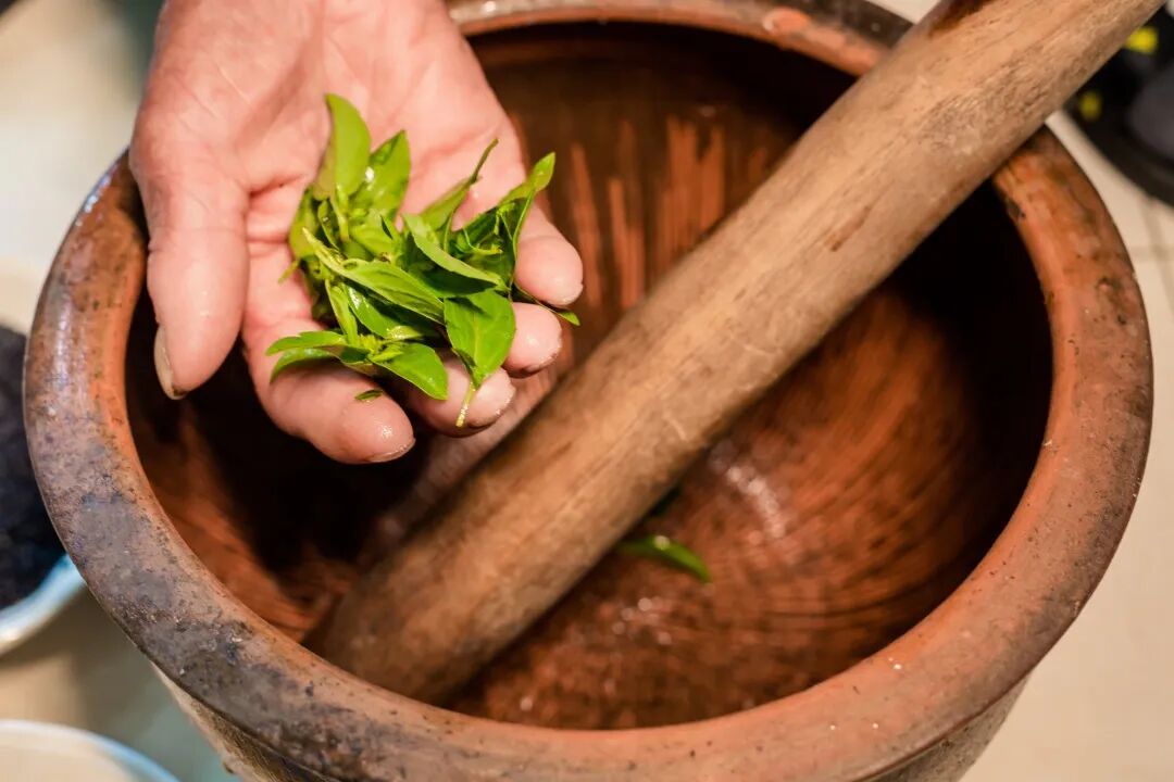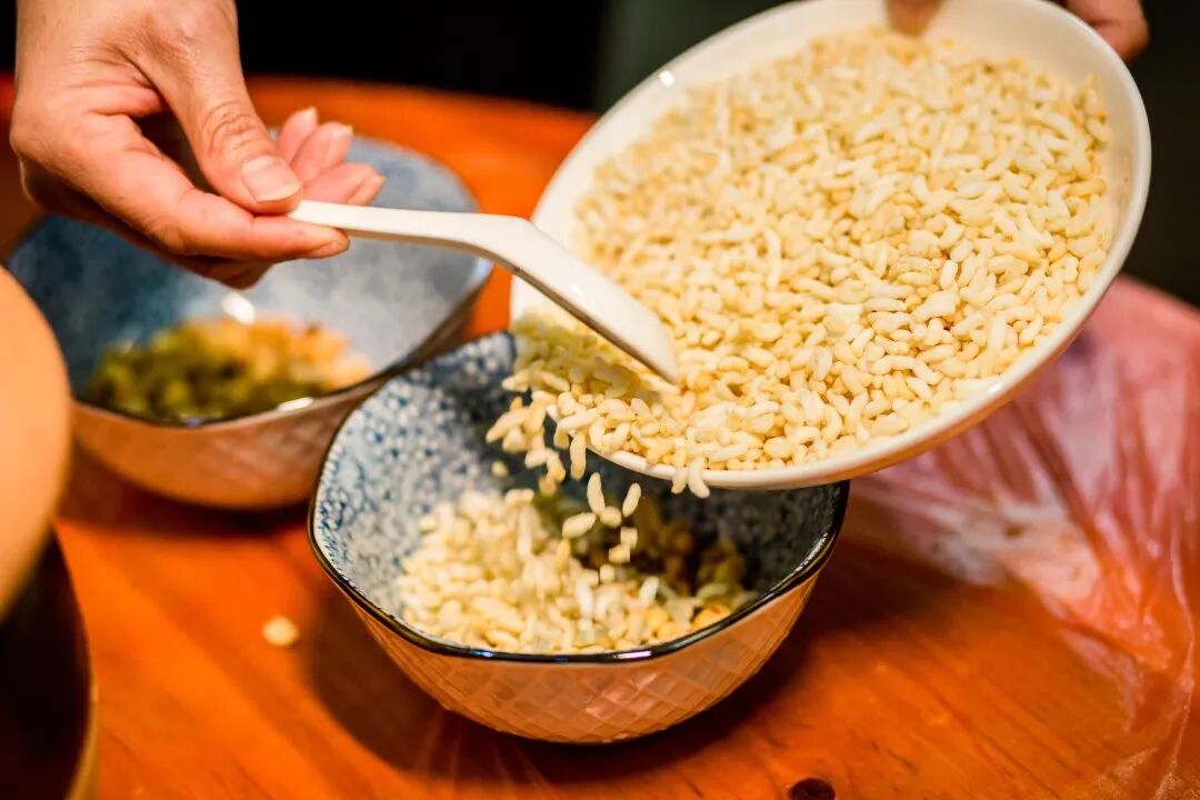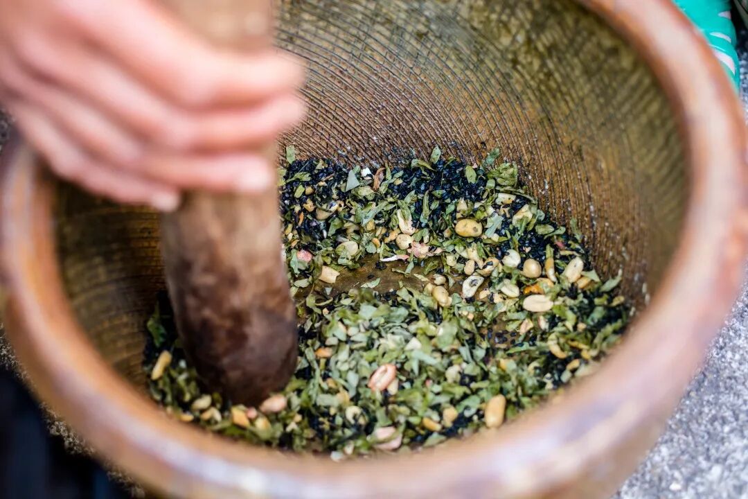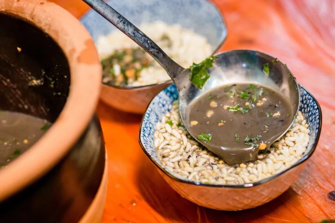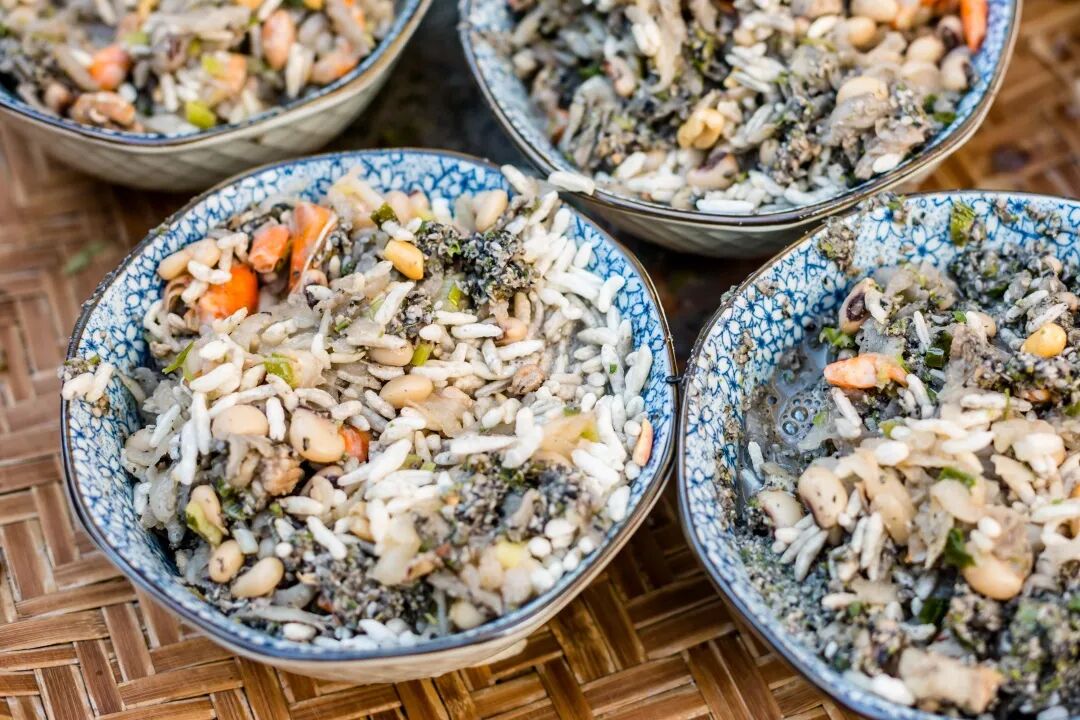 山区片区擂茶取材主要以新鲜茶、熟芝麻、花生米再加少许的盐用特制的擂钵(俗称牙钵)擂成糊状,加入开水即可。食用时再加入少许花生米和爆米花(俗称炒米),既可充饥,也可解渴。