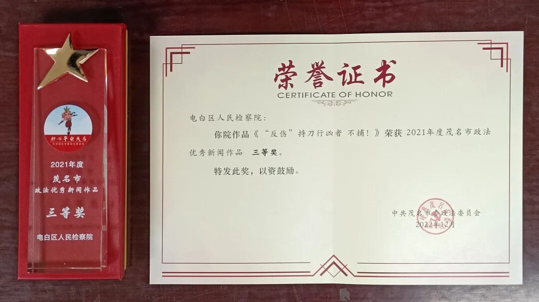 作品《“反伤”持刀行凶者 不捕!》荣获2021年度茂名市政法优秀新闻作品三等奖。