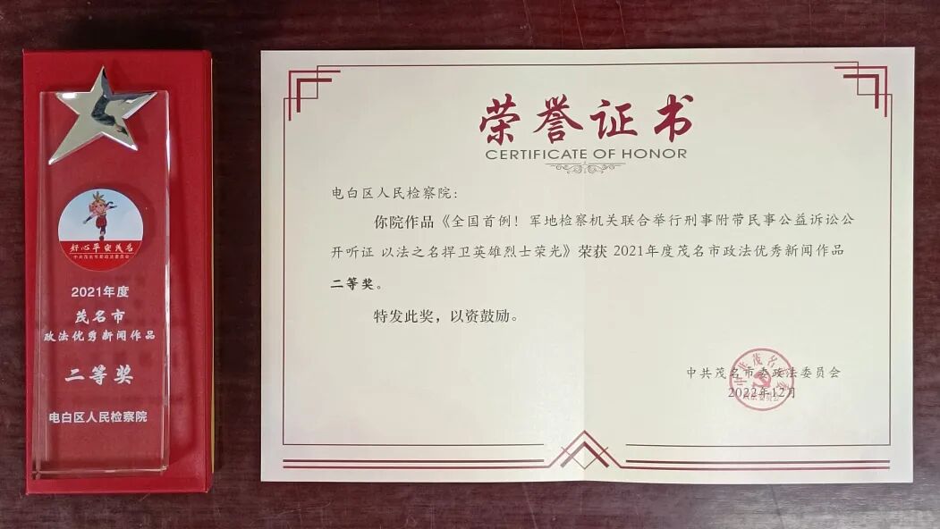 作品《全国首例!军地检察机关联合举行刑事附带民事公益诉讼公开听证 以法之名捍卫英雄烈士荣光》荣获2021年度茂名市政法优秀新闻作品二等奖。