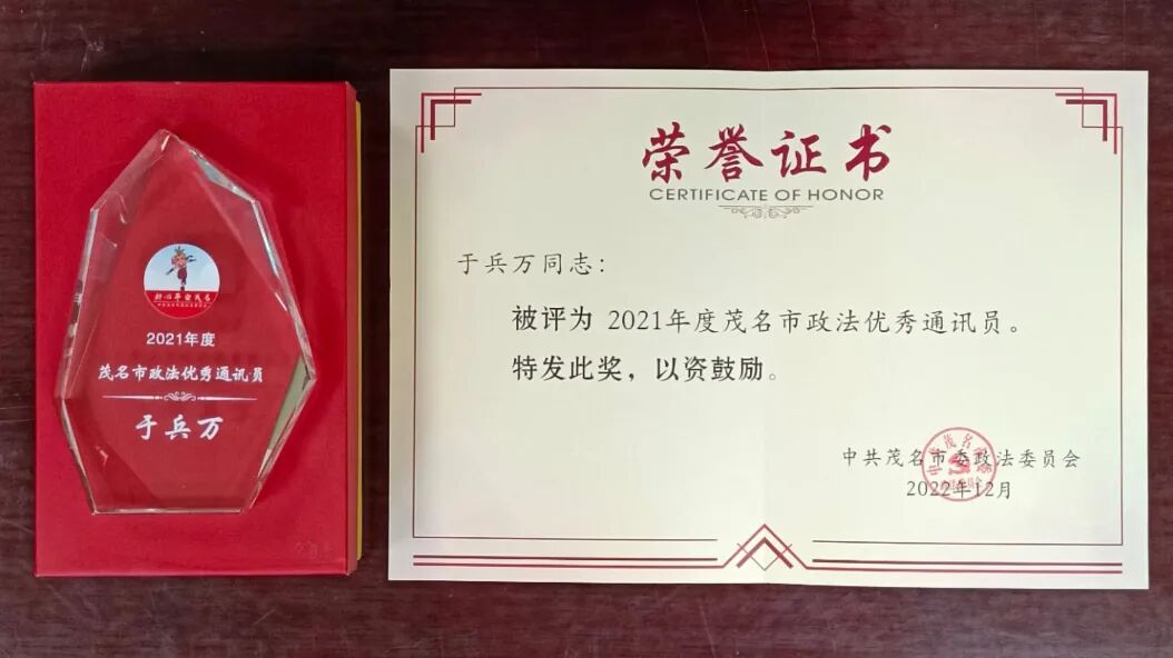 于兵万同志被评为2021年度茂名市政法优秀通讯员。