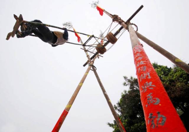荡秋千是潮汕人非常喜爱的一种民俗文化活动,多在正月特别是元宵前后举行。正月对于潮人来说,是一个既忙碌又兴奋,热闹又快乐的月份。饶平县樟溪镇龙潭埔村正月荡秋千别具一格,每年正月初一下午,村民便在村寨广场上搭起一个五米高的秋千棚,凡去年添丁的人家都要备生熟相掺的几筐花生,登上秋千棚,向棚下早已翘首以待的人们撒花生,直到把所有花生撒完为止。棚下的人们尤其是将为人父的后生兄都争夺。据说抢多者就能生男孩,故后生兄们乐此不疲。至今仍流传着“抢花生、熟掺生,年年双生(双胞胎)”这样的歌谣。揭阳市炮台镇桃山乡正月几乎天天男女老小都荡秋千,但是元宵节那天,男人不能登上秋千棚,整个秋千活动只能站在一旁观看。有些乡村元宵夜年轻夫妻要跑到村里老榕树下荡秋千,任村人往身上泼粪,说是被人泼得越多,越能在今年生男孩,真是不可思议。