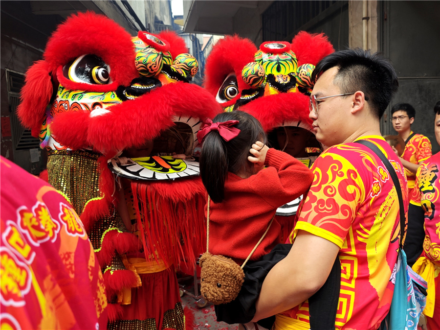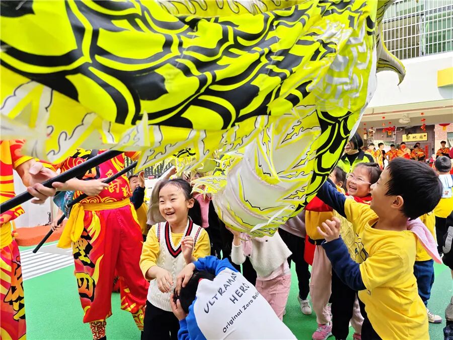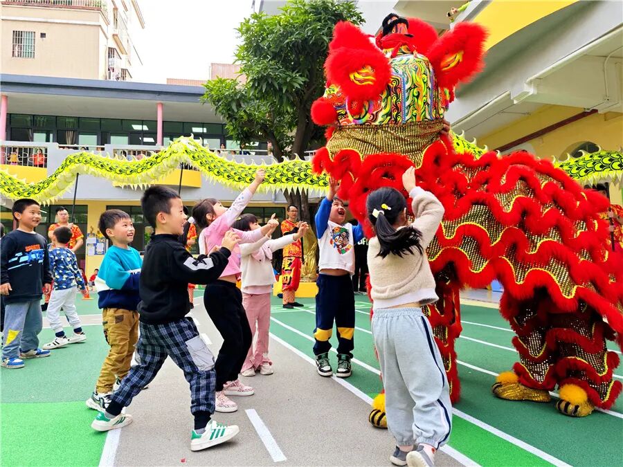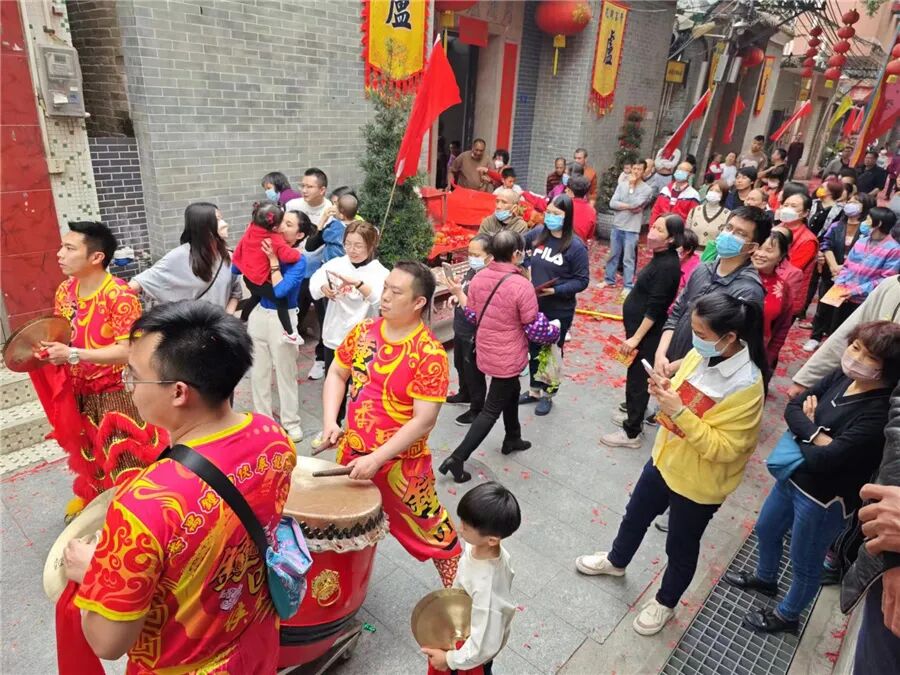 从康公古庙走出来,跟着狮队穿街过巷进行环村巡游,每逢到村中祠堂,狮队金龙都会入内拜贺,锣鼓声里活灵活现的醒狮、威风凛凛的金龙,引得街坊走出家门围观拍照。当醒狮进入幼儿园,萌娃们更是齐齐围住醒狮摸个不停,跑到金龙身下,玩得不亦乐乎。