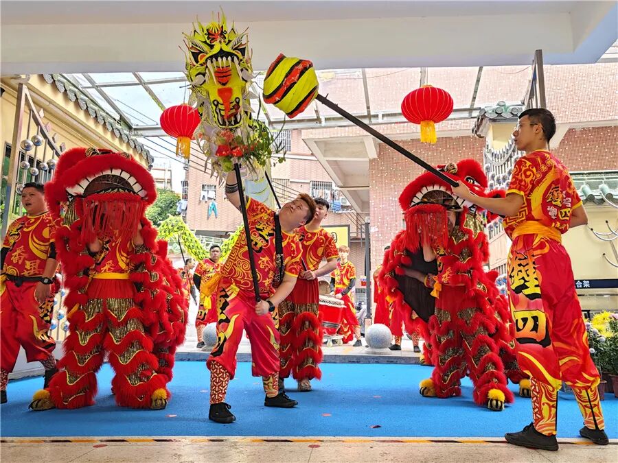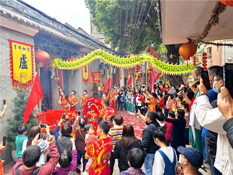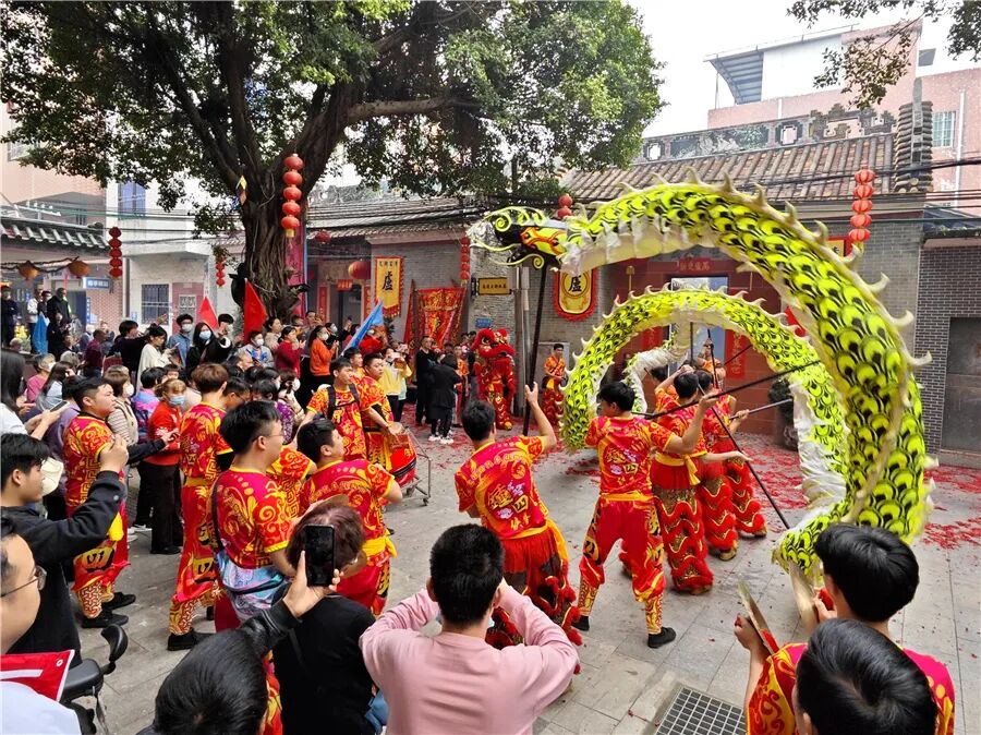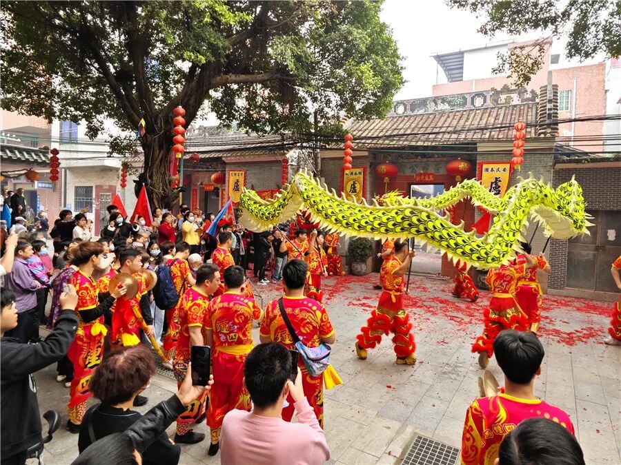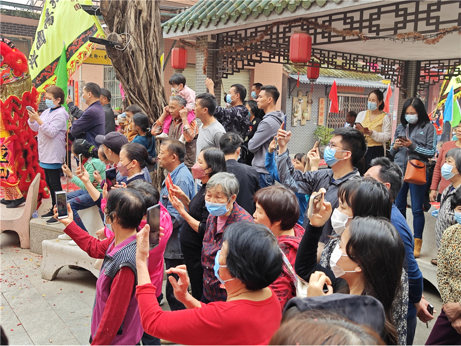 此次康公诞,仪式简化,但热闹不减。2月8日上午,钟四村康公古庙前锣鼓喧天,来自钟二村、钟四村、汉溪村的三支狮队与一条金龙齐齐拜主帅贺康公诞,并上演精彩的采青表演。完成庆祝仪式后,狮队分别返回各自村,敲锣打鼓进行环村巡游,一路上村民街坊夹道欢迎,举起手机记录这一民俗盛事。