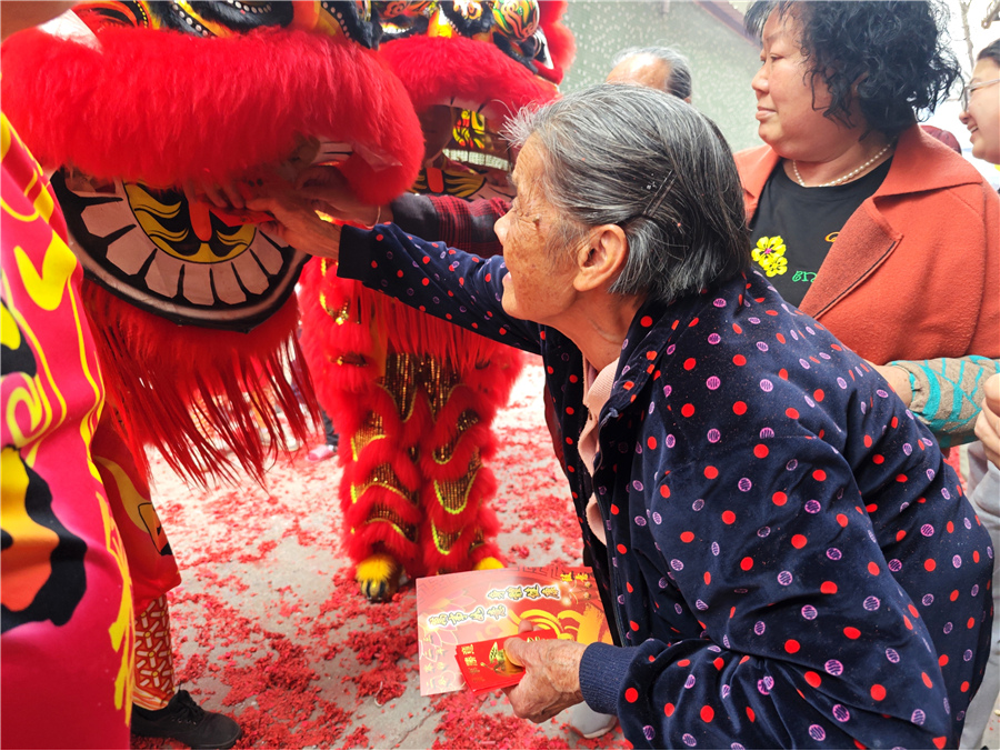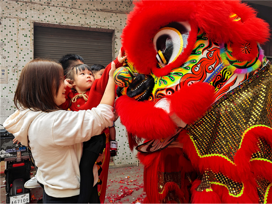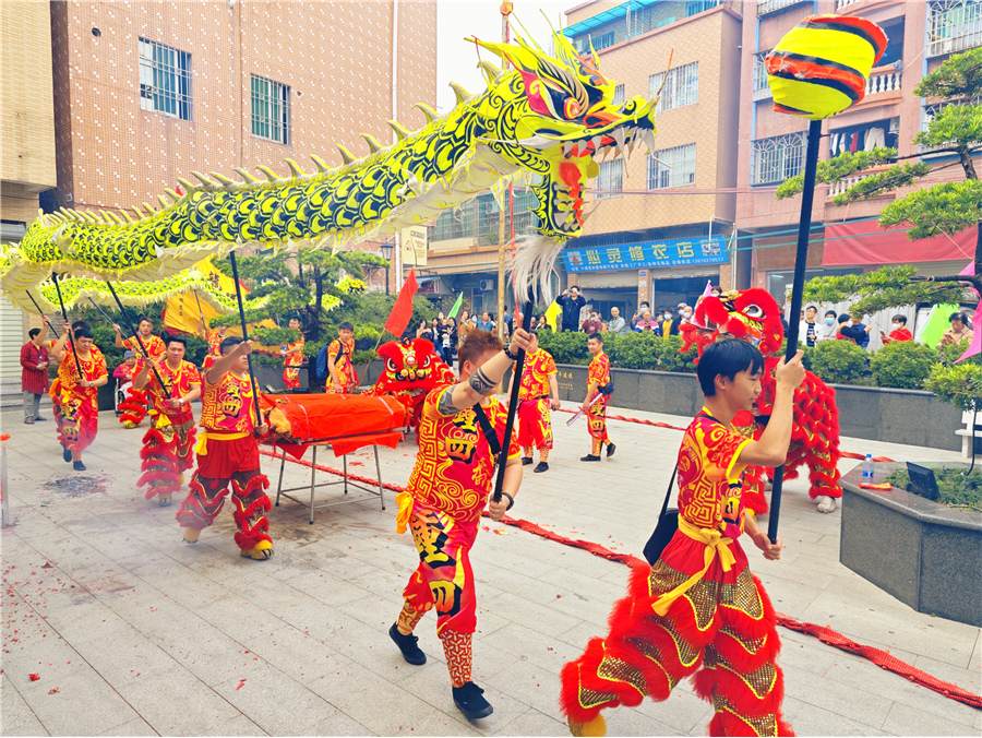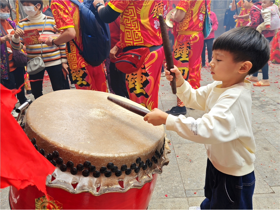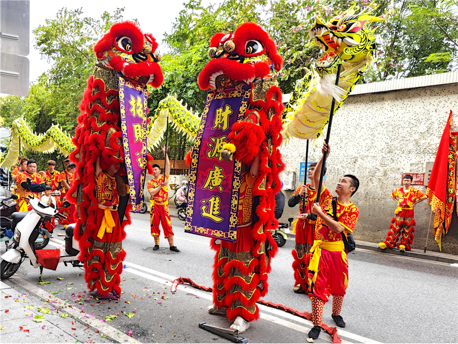 此次康公诞,仪式简化,但热闹不减。2月8日上午,钟四村康公古庙前锣鼓喧天,来自钟二村、钟四村、汉溪村的三支狮队与一条金龙齐齐拜主帅贺康公诞,并上演精彩的采青表演。完成庆祝仪式后,狮队分别返回各自村,敲锣打鼓进行环村巡游,一路上村民街坊夹道欢迎,举起手机记录这一民俗盛事。