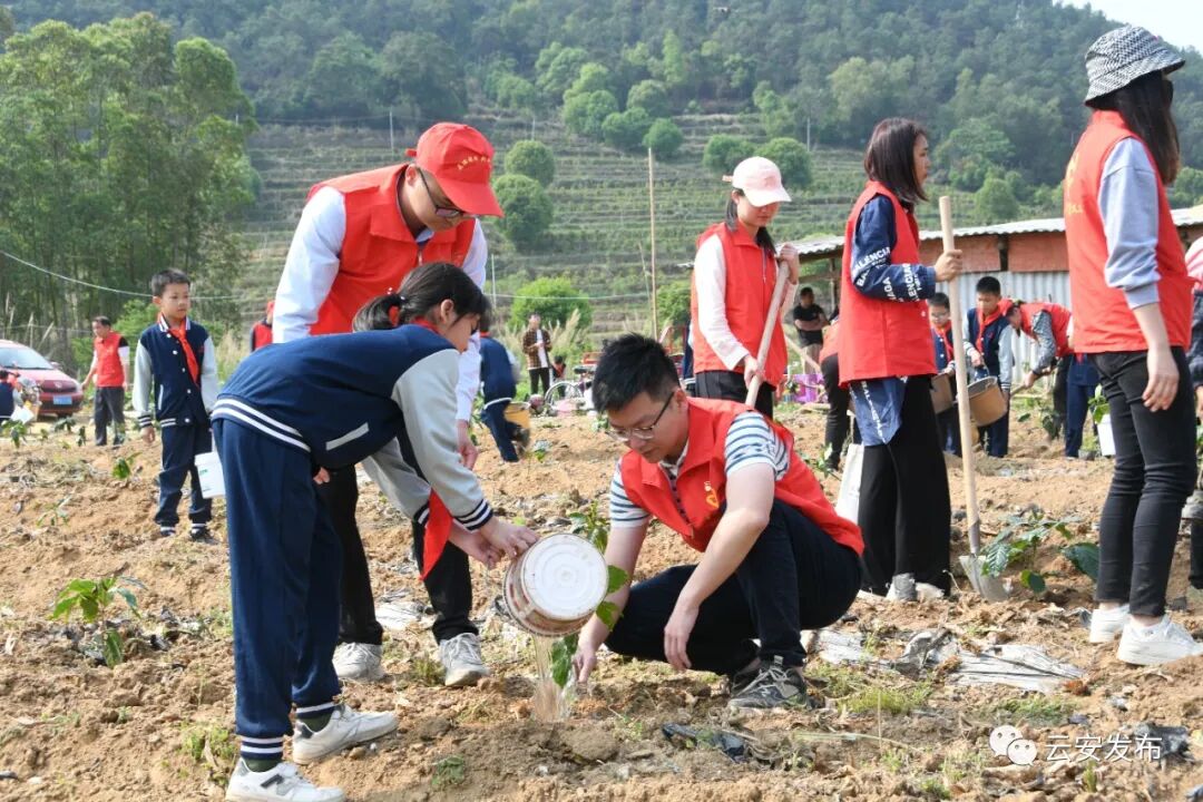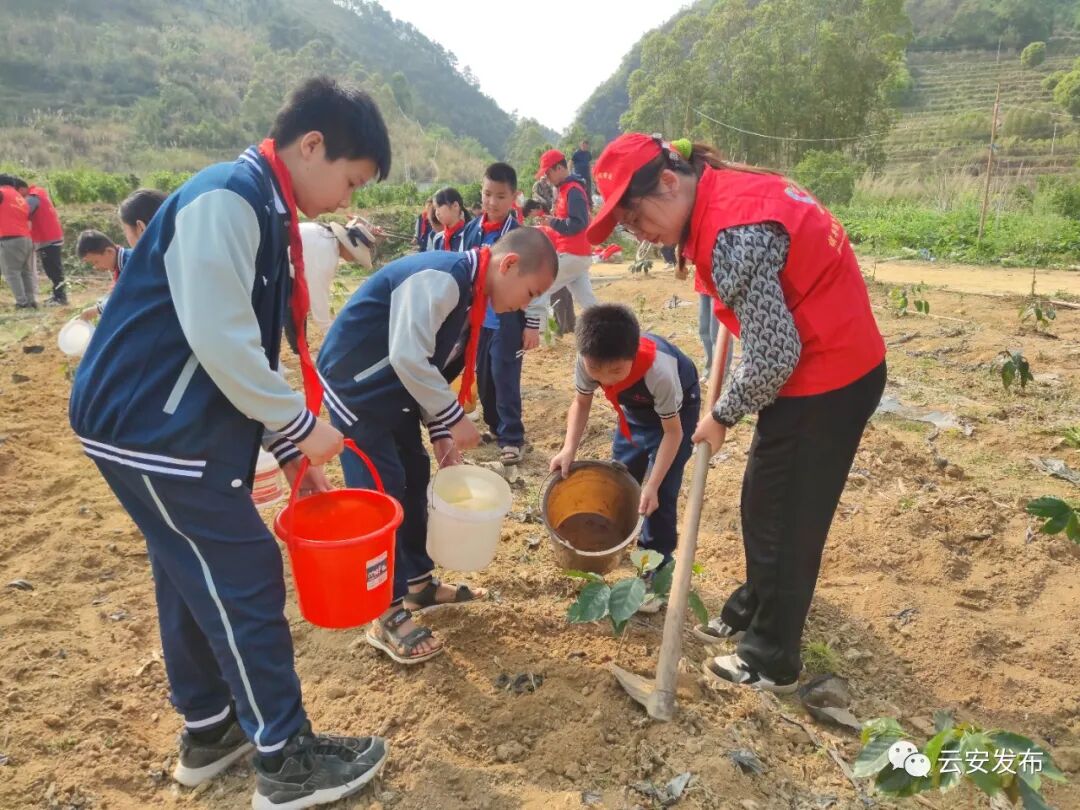 党员带团员,团员带少先队员。活动现场大家手持锄头、铁铲、水桶等工具,互相分工协作,运咖啡树苗、培土、浇水……每一道工序都做得一丝不苟、有条不紊,现场一片热火朝天的春耕景象。