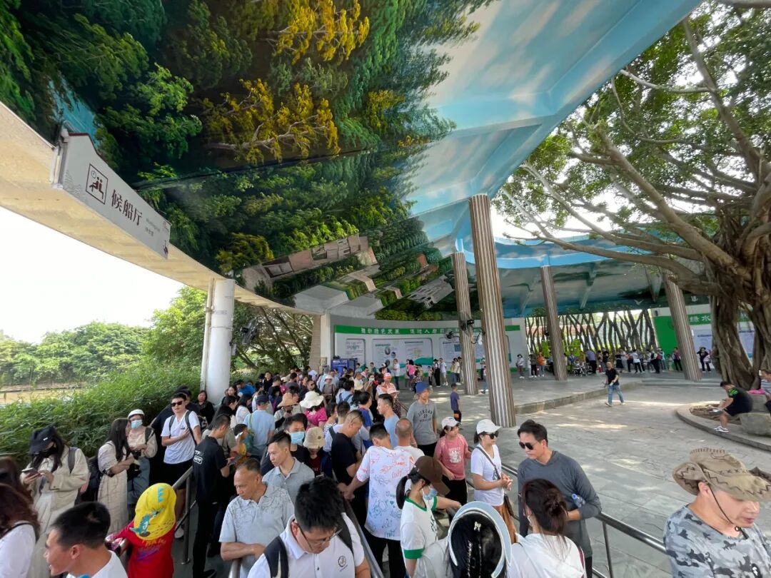 游客有序排队游船观赏小鸟天堂
