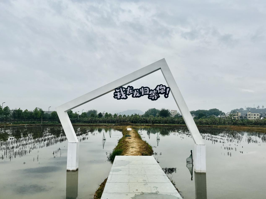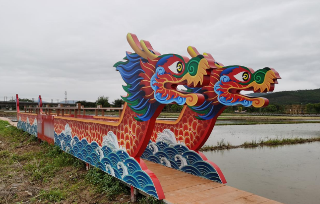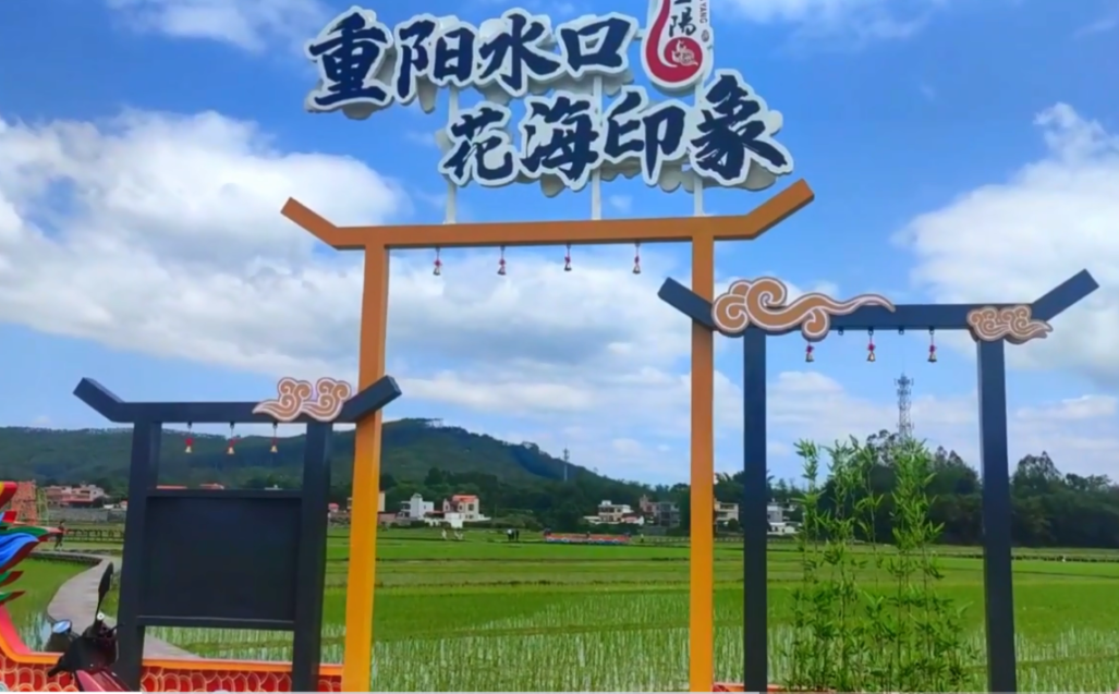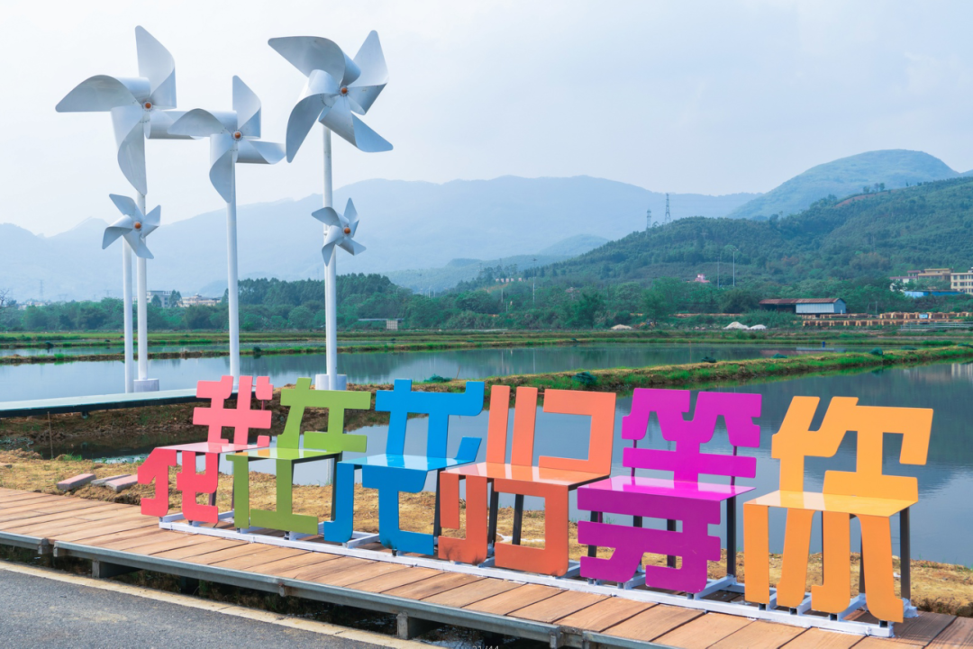 水口村最大规模的油菜花田上,最新修建了油菜花观光栈道,设有秋千、休憩小平台、心形走廊、气球飞屋、花海及龙舟元素等互动式特色景观,栈道并连接高处的观景平台(阅龙亭)。