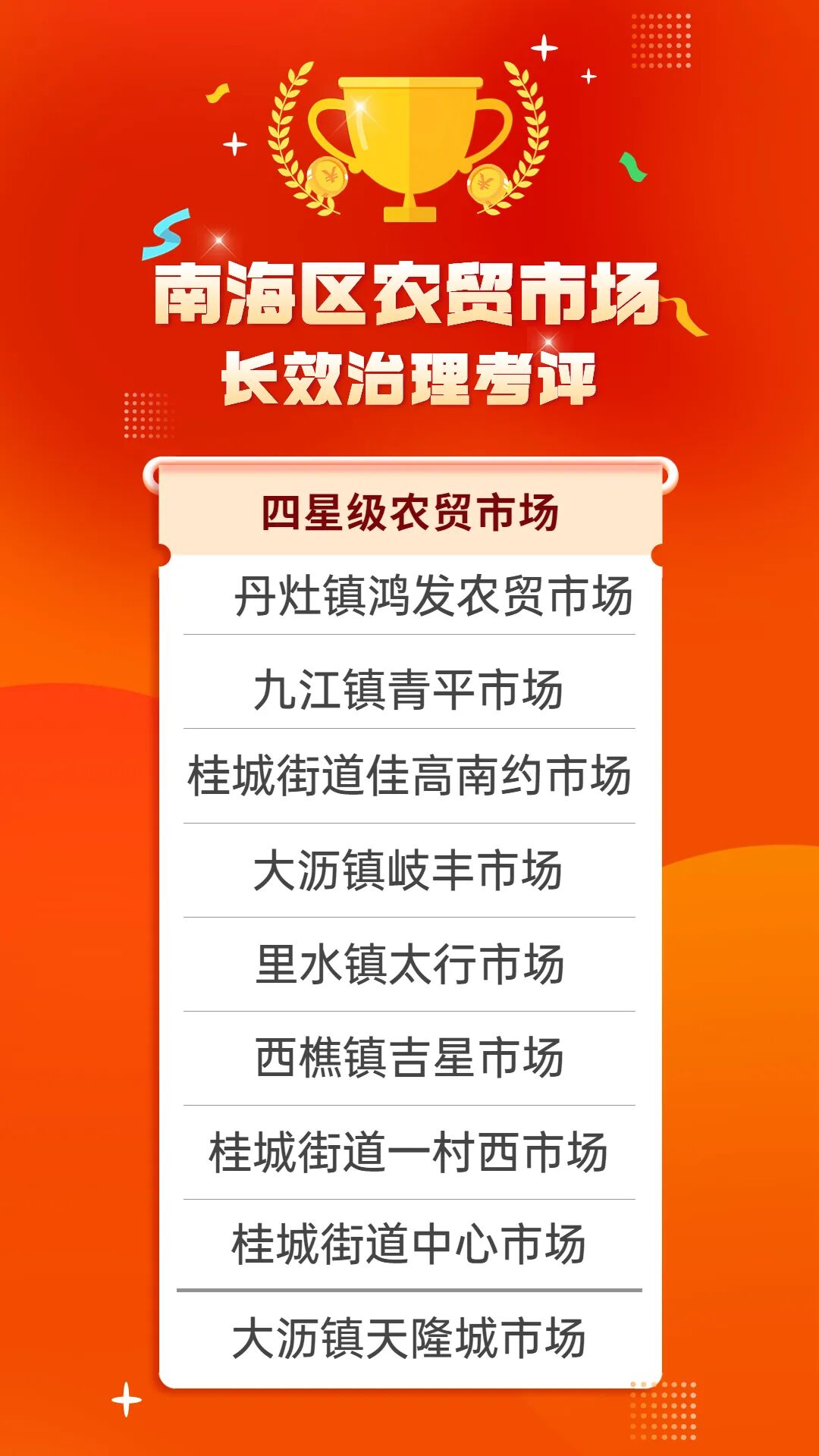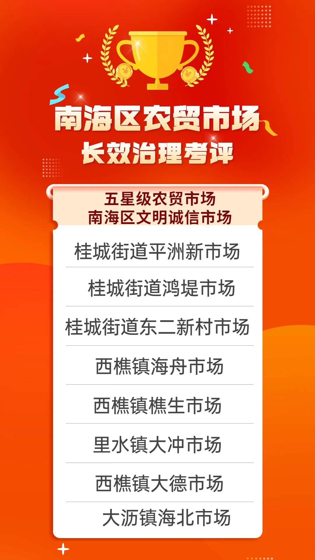 近日,2022年南海区星级农贸市场长效治理考评结果出炉。经区镇考评、第三方考评、超2万名市民线上评分等,南海区农贸市场长效治理工作专班在参与考评的171家农贸市场中,共评出“五星级市场”评价8家、“四星级市场”9家、“三星级市场”8家。被评选为“五星级市场”的市场主体还可获得20万元的奖励,并授予“南海区文明诚信市场”称号。