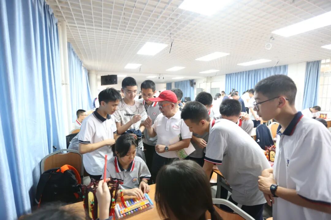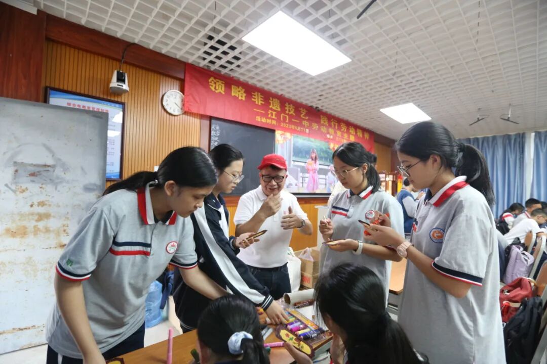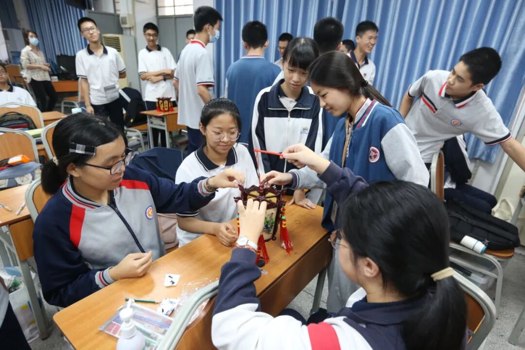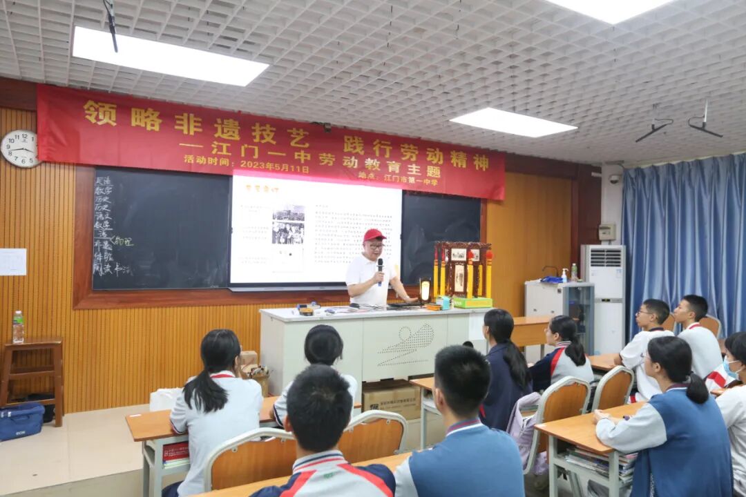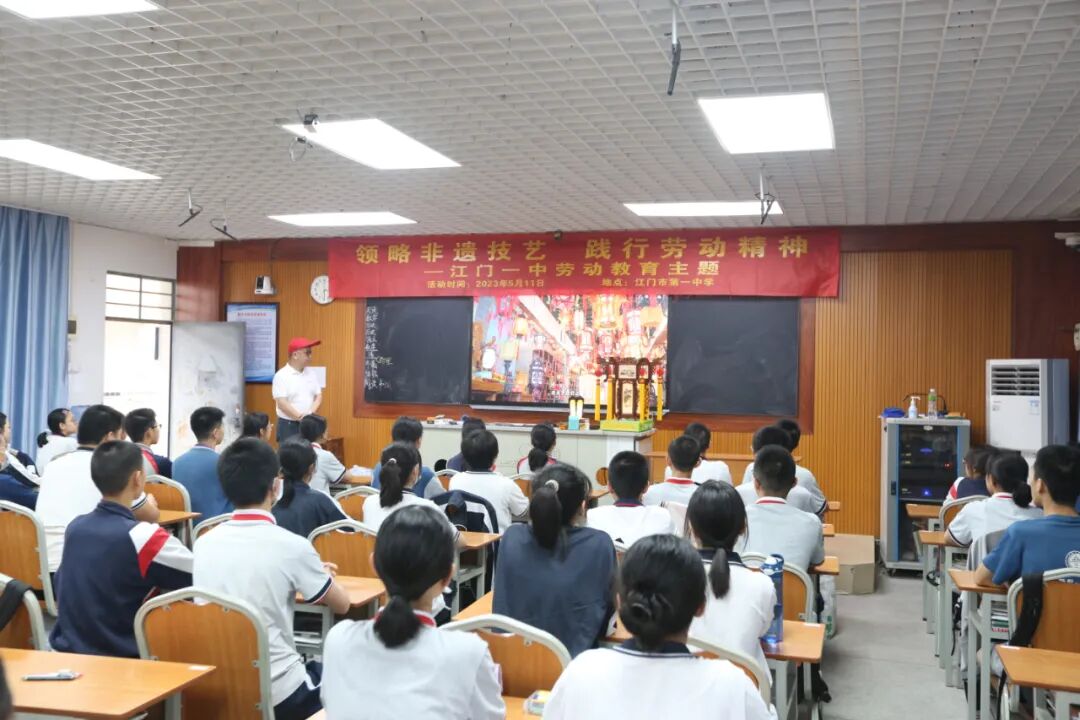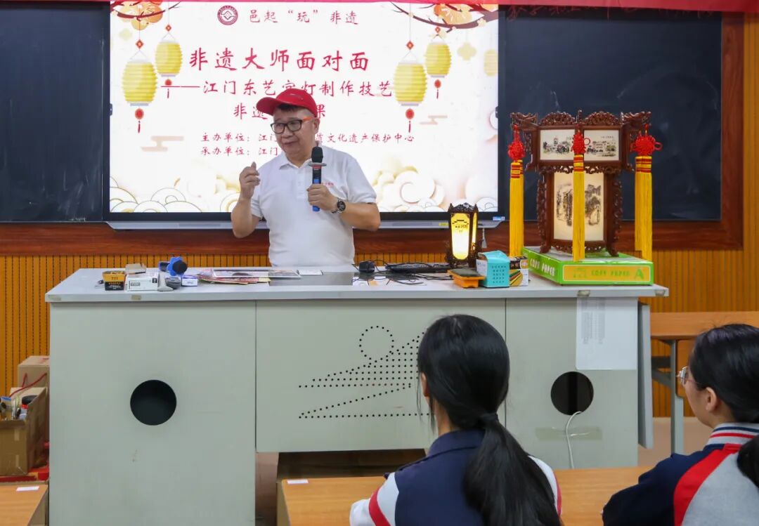 灯作为照明的工具,驱赶了黑夜带给我们的恐惧,散发出的光亮就是一种希望的象征,但灯在形态的构造上其实早已走出了自己风格“美”,特别是每逢节日庆祝,各式各样的灯被高高挂起,人们将生活的期盼都寄托在灯上。宫灯制作技艺(江门东艺宫灯制作技艺)是江门市非物质文化遗产中代表传统灯文化的翘楚,在传承发展中不断创新,既充实五邑地区人民的生产生活,也点亮了五邑华人华侨的“乡情”。为传承发扬五邑地区非物质文化遗产,弘扬工匠精神,坚定文化自信,让非遗走进校园,走近青少年,借助非遗的展示与体验活动,丰富和满足青少年日益增长的精神文化生活需求,以非遗与社团活动相结合的形式,让青少年“零距离”体验非遗的魅力,由江门市非物质文化遗产保护中心主办,江门市第一中学承办的“非遗大师面对面——东艺宫灯进一中”非遗体验课于5月11日举办。