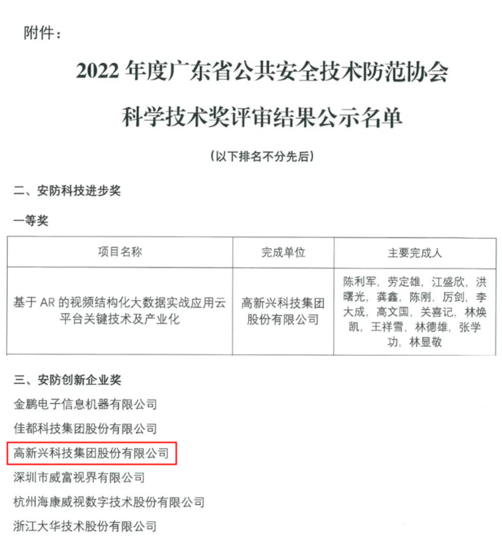 4 月 27 日,广东省公共安全技术防范协会第五届会员代表大会暨换届选举大会在广州顺利举行。在同期的颁奖盛典上,高新兴“基于AR 的视频结构化大数据实战应用云平台关键技术及产业化”荣获安防科技进步奖一等奖、安防创新企业奖。