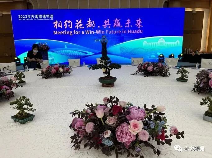 5月16日,广州市人民政府外事办公室与花都区委区政府共同举行外国驻穗领团“读懂花都”活动,来自20个国家驻穗总领事馆的38名领馆官员及家属走进花都,交流合作。在花都区推介会上,一批产自赤坭镇的微盆景,造型优美、隆重迎客。