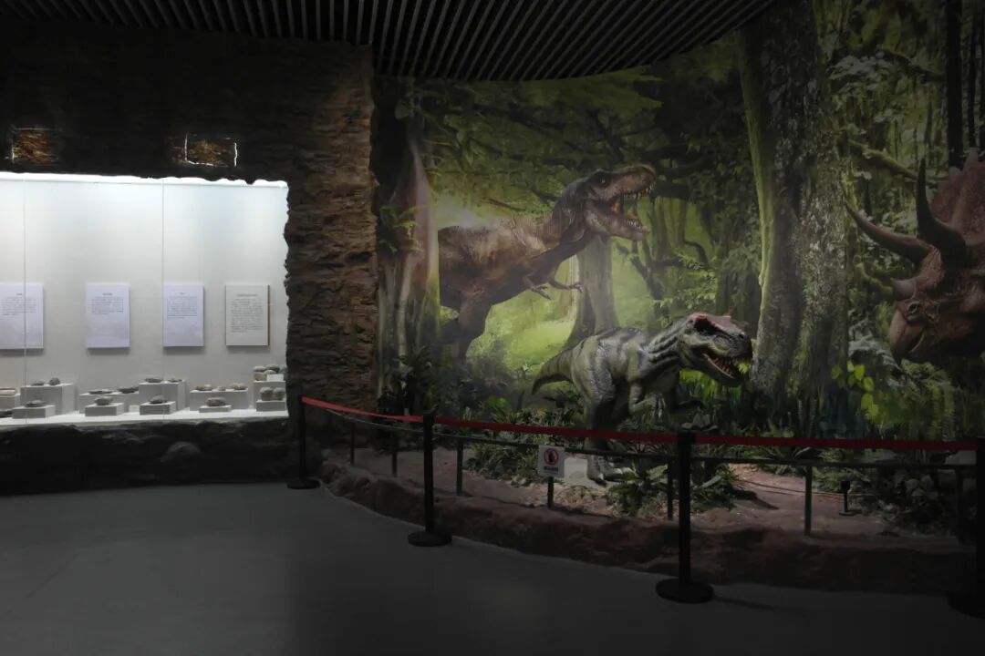 在陈列形式方面,序厅左右两侧设计了大型油页岩场景,配以茂名露天矿开发时热火朝天的背景照片,并用油页岩的造型展示前言,以勒石铭刻的方式述说茂名露天矿开发的历史及茂名崛起的艰辛与辉煌。“自然的馈赠,历史的选择”部分复原史前恐龙、犀牛骨骼化石场景,通柜也设计成油页岩的外观,营造史前生态。“茂名油页岩露天矿的建设与开采”部分则通过几何形的展板造型、展柜组合和天花多层次穿插,结合勘探工人的雕塑场景展示油页岩勘探的艰辛过程;石油工业部茂名油页岩公司筹建处的设计,则利用半实物场景半老照片结合,增加了展览的纵深感和趣味性;油页岩开采的大型场景设计,把工程指挥部、大型推土机、钩机、斗车、高分子硅胶人像、油页岩实物和平面构成的背景巧妙地结合起来,让观众更能体现沉浸式观展的氛围;“向毛主席报喜的回信”油画引导观众重温激情燃烧的岁月。“茂名炼化基地的崛起”部分利用了管道、钢结构、乙烯蒸馏装置等元素来进行空间的形式设计,给人熟悉的“石化感”。“茂名城市建设与变迁”通过“六百户”模型、日常生活场景复原等对比手法,展示改革开放后人民生活水平有了显著的提高。“矿山的整治与露天矿生态公园建设”部分通过提取抽象的大树、小木屋、蓝天白云等元素符号及材质肌理的对比,体现了人与自然的和谐共处,很好地展示了陈列的主题。