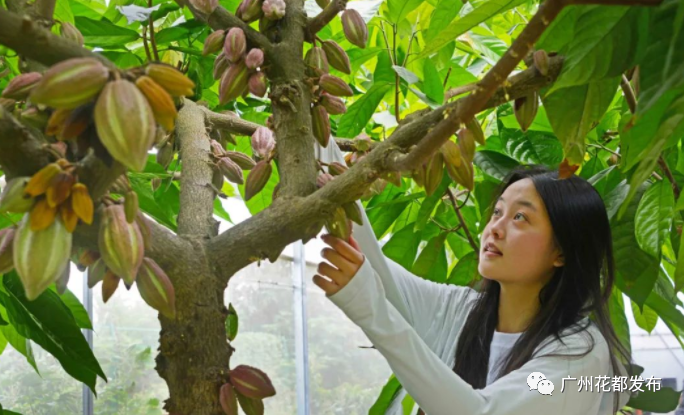 2020年7月,中国热科院广州研究院正式落户赤坭镇。走进国泰村中国热带农业科学院广州实验站的大棚,让您大开眼界,一睹可可树和可可果实的真容,中国热带农业科学院广州实验站的工作人员陈丽娜说:“可可是世界三大饮料作物之一,原产于南美洲亚马逊河流域,1954年由华侨引入海南兴隆华侨农场试种成功,可可特别的芳香,可可果直接生长在树干和主干上,外形像木瓜,可可果皮厚实坚硬,果肉甜美多汁,味道极像山竹,每个可可果里都有25~40颗可可豆,主要用于制作巧克力、饮料、糕点和冰淇淋等,含有丰富的类黄酮、膳食纤维及矿物质营养元素等,实验站在这里种植了一亩地可可,共有40棵可可树,主要是用于科普示范,让大家认识可可树,体验可可的加工制作,巧克力的制作,还有可可的健康知识普及,可可可以软化心血管,小朋友可以补钙,对人体有很多的益处。”