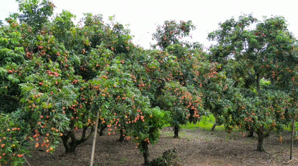 6月13日,记者在黎少镇泗片村大花村看到,一串串沉甸甸红彤彤的荔枝挂满了枝头,果实颗颗饱满、长势喜人。