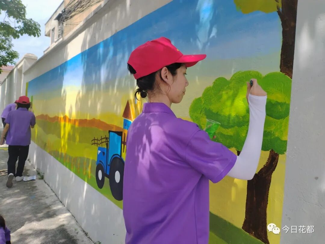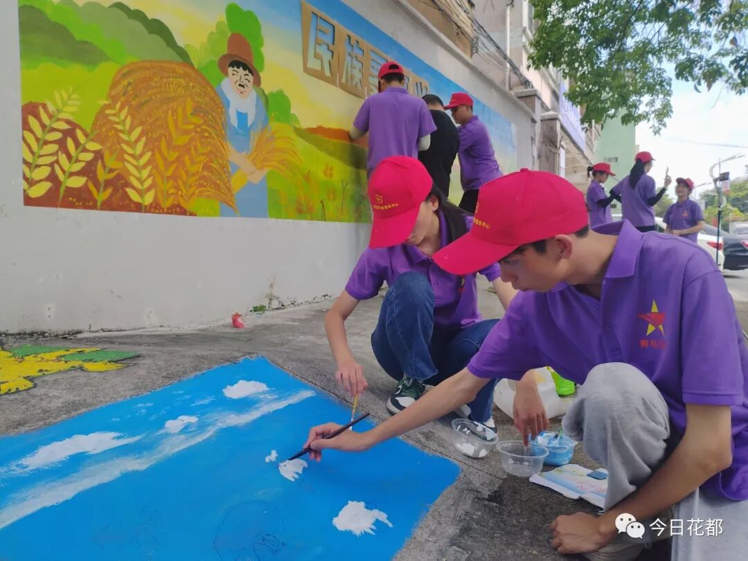 7月10日,在花山镇两龙社区一面临街的墙壁前,一群大学生顶着烈日在墙上绘画。