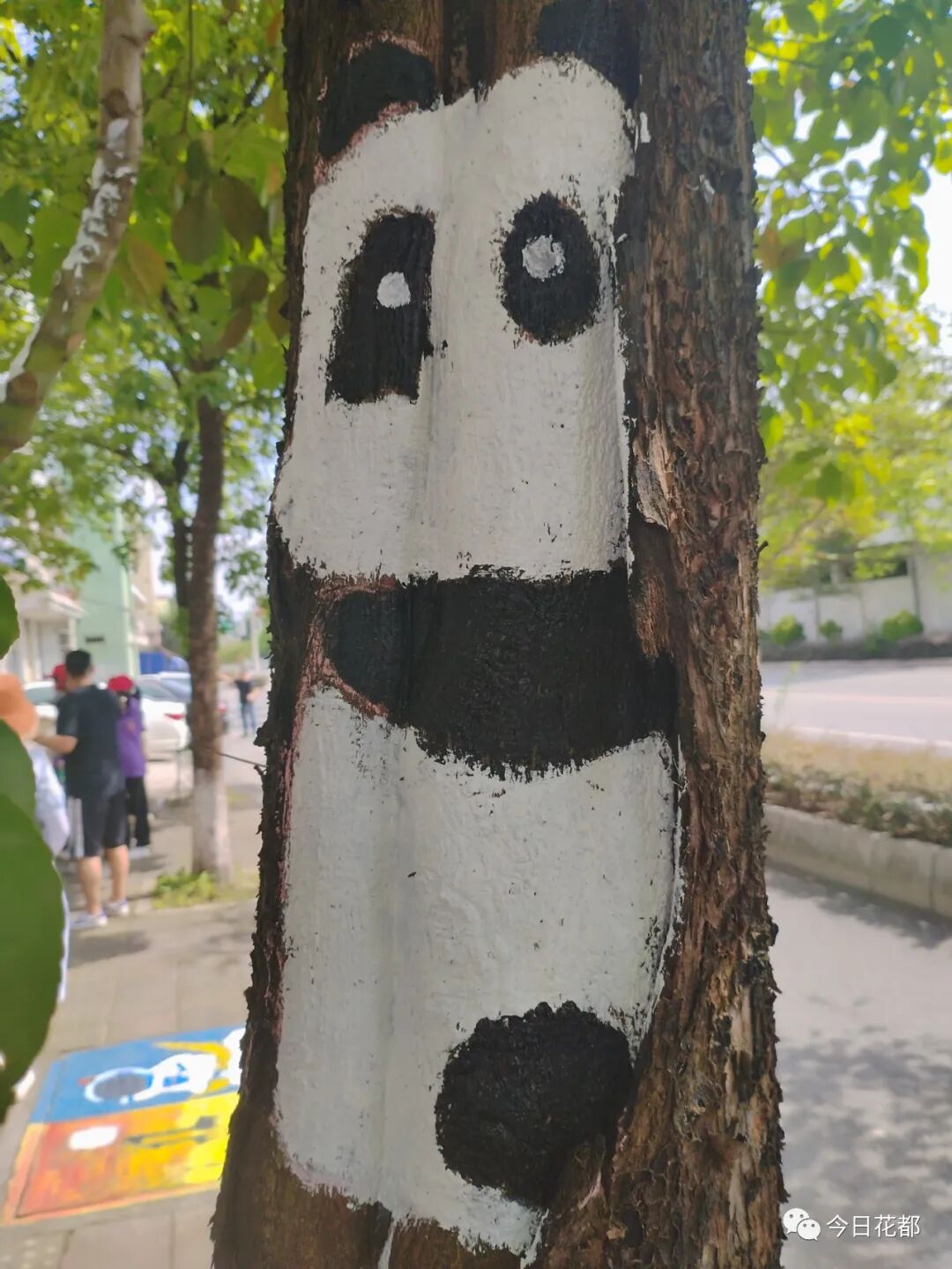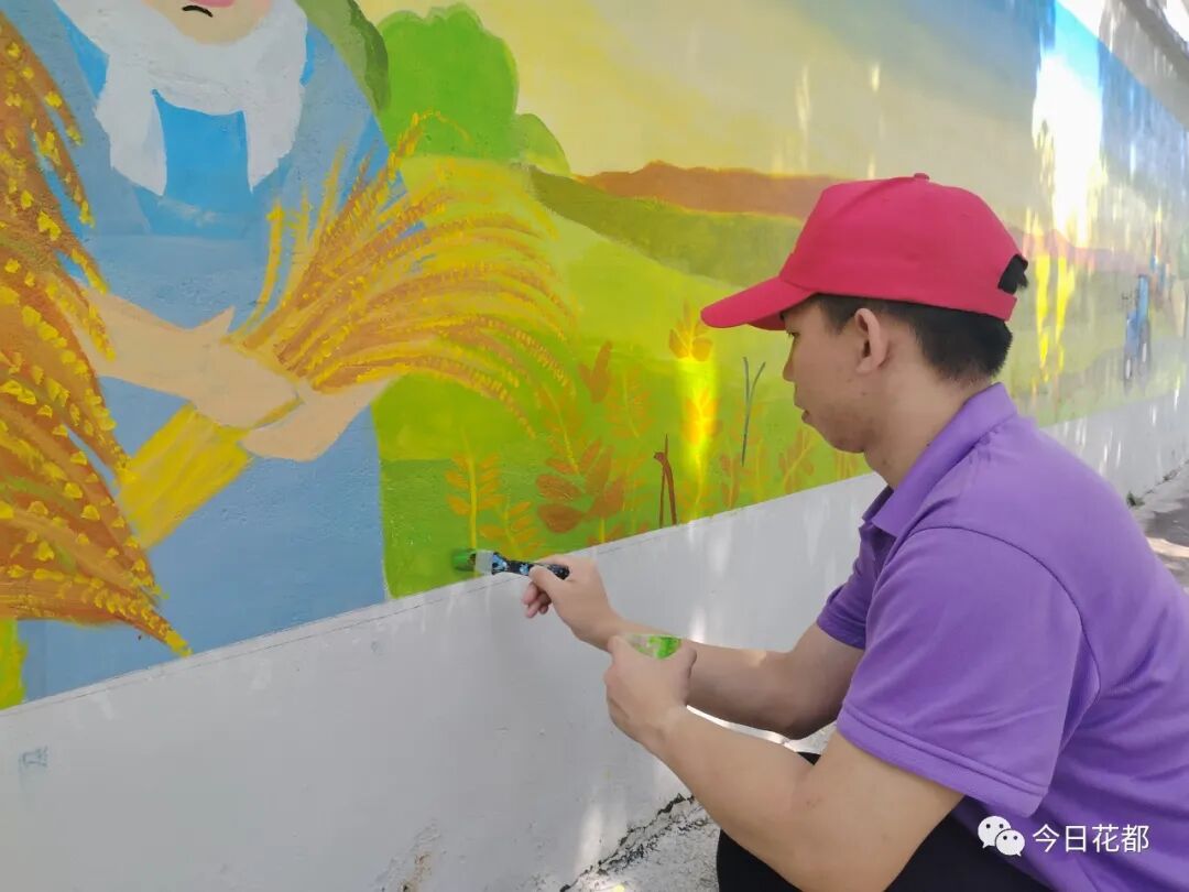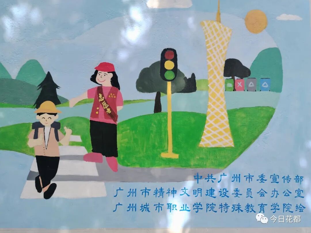 两龙社区位于花山镇中部,主要负责花山镇内所有小区,辖区老旧楼房多。为进一步提升辖区市容市貌,社区党支部联合辖区广州城市职业学院特殊教育学院,利用大学生“三下乡”社会实践的契机,将临街的一些破旧墙面、下水道井盖、破损树干,通过师生的画笔进行装扮美化。通过乡村振兴、文明交通等主题墙绘传播文明新风尚,传递社会正能量。