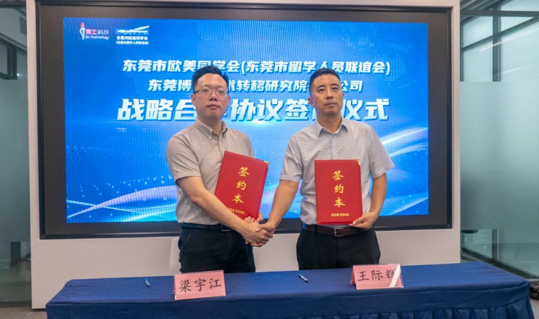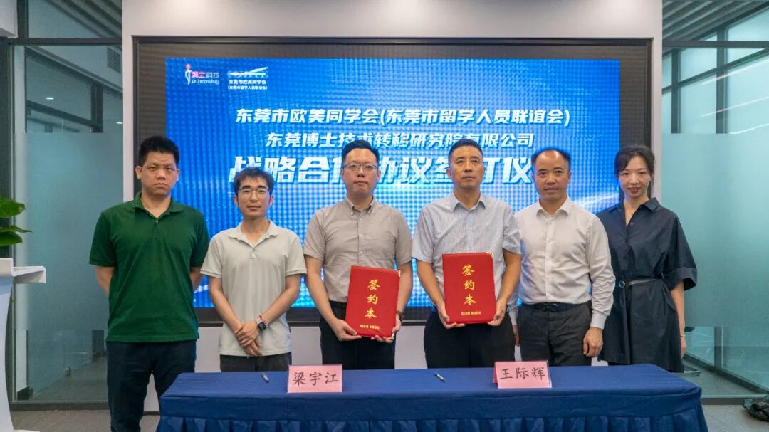 7月11日上午,东莞市欧美同学会(东莞市留学人员联谊会)与东莞博士技术转移研究院有限公司签署战略合作协议,共同推动2023“松湖杯”创新创业大赛成功举办。东莞市欧美同学会会长王际辉、秘书长郑盛平,东莞博士技术转移研究院有限公司常务副总经理梁宇江,以及双方相关部门负责人参加签约仪式。