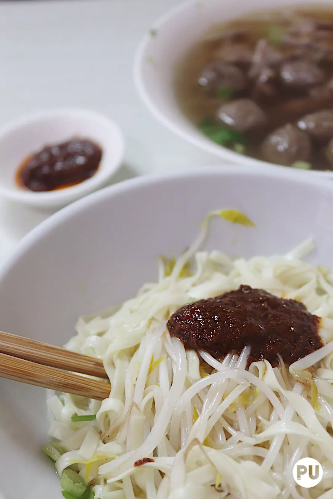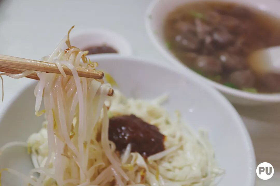 潮汕干面的主要原材料面条必须是富有弹性的,用开水猛烫后沥干水分,趁热放进碗里,淋上店里特制的沙茶酱,搅拌均匀,趁热吸一大口,满足!