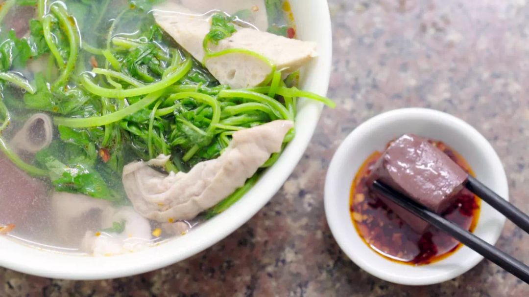 在潮汕,一般的猪血汤都是以猪血汤作底,再烫上一些猪肉,内脏,西洋菜或是潮汕本地的益母草等,有的还会加上薏米。短短几分钟,巧夺天工的店主便会把一碗汤呈现在你面前。