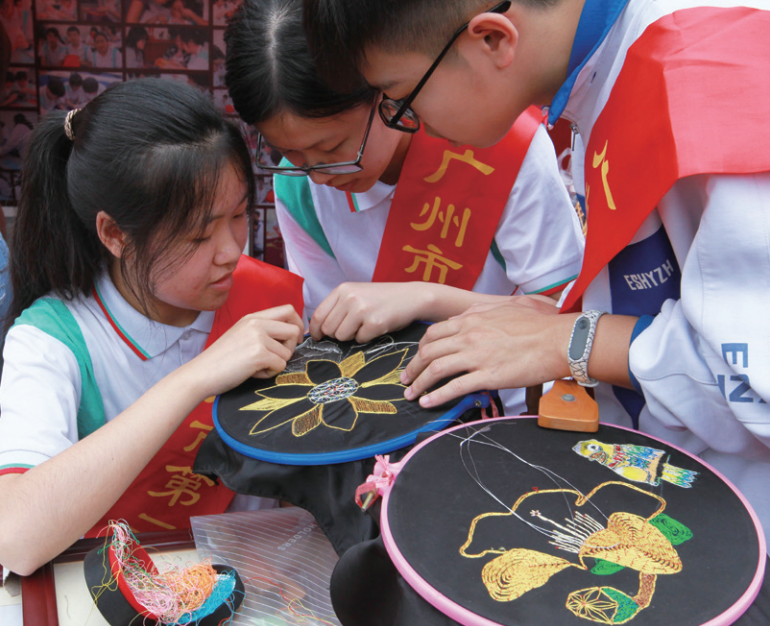 广府文化进校园活动中,学生们在学广绣