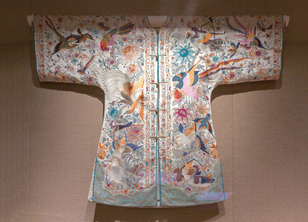 民国白缎地广绣百鸟纹对襟长氅衣,现藏于广州十三行博物馆
