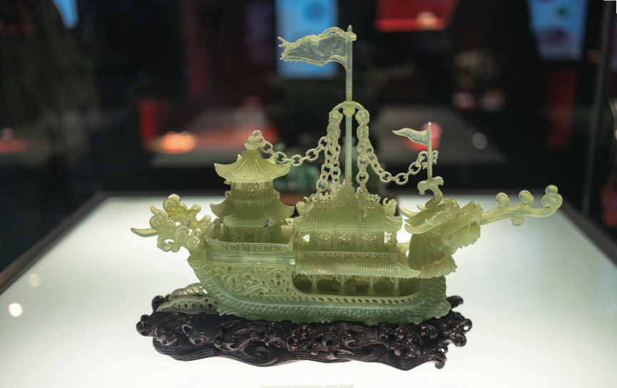 广东省博物馆内宝石馆收藏展览中的“岫玉龙舫”玉雕作品