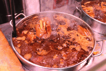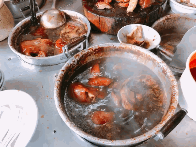 然后猪脚块泡在香料酱油里,先大火烧开,再转小火熬肉,使多余的油脂渗入卤汁,肥肉瘦肉卤到极端透彻...