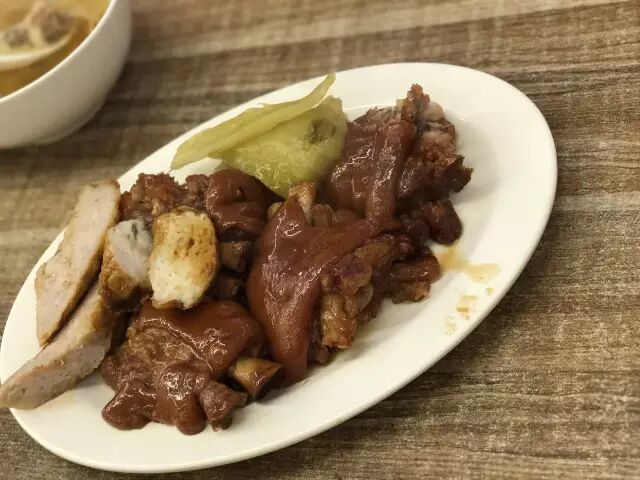 这家是典型的苍蝇馆子,提供各式猪脚拼饭、各式卤水快餐,还有猪杂汤饭和汤粉