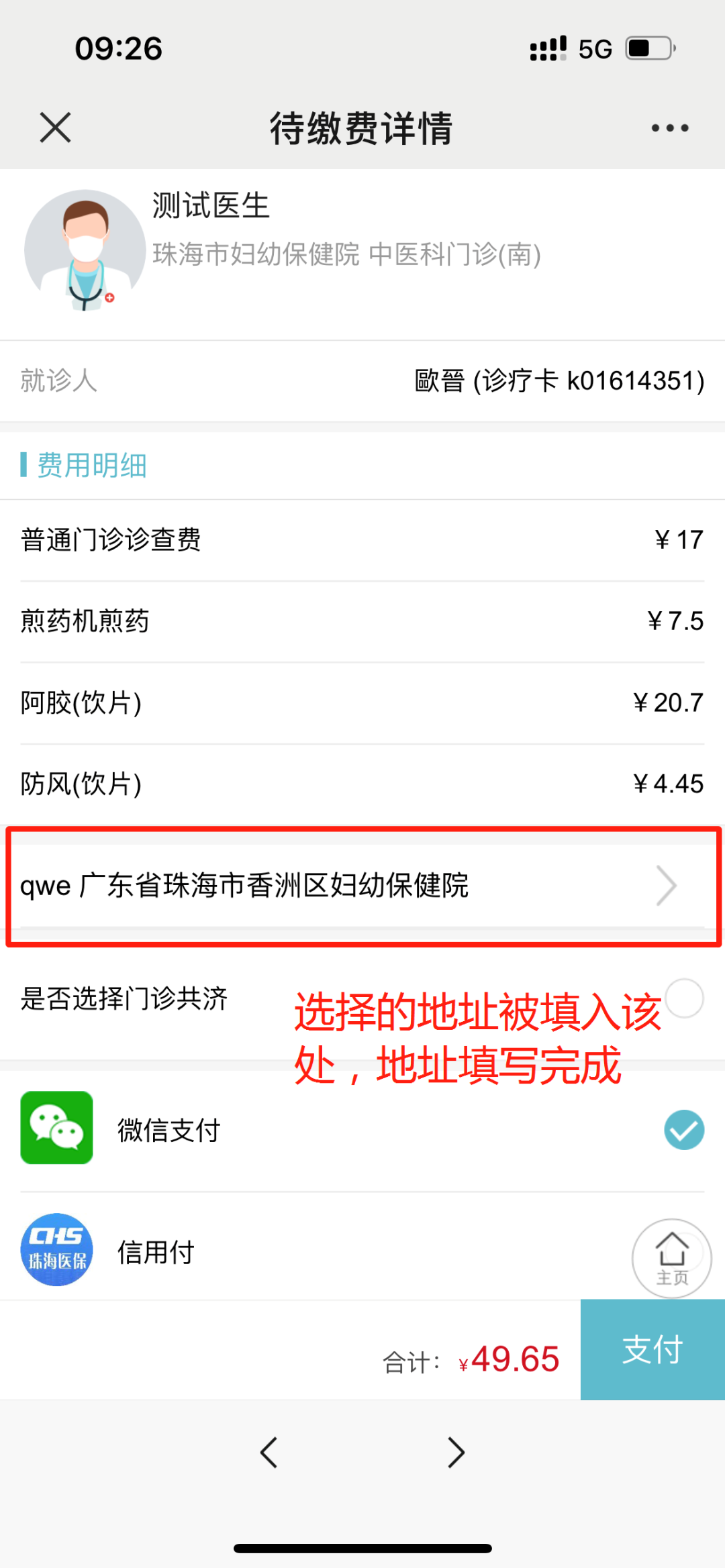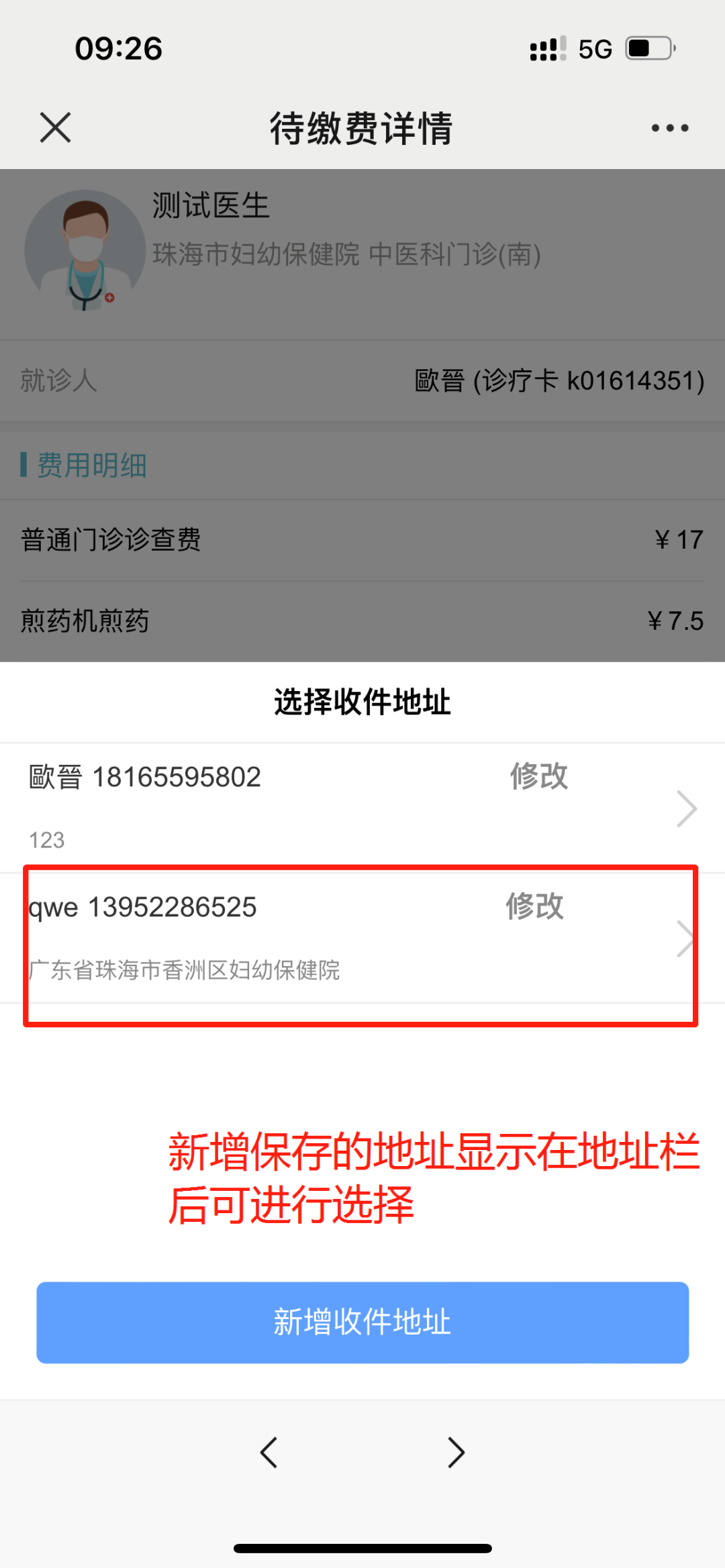 1.扫缴费码后需完整填写患者配送地址、联系电话等信息,红色框内为必填项,其中选择人工窗口或自助机缴费的患者也需要先扫码自行填写收件地址,地址填写完成后方可在人工窗口及自助机缴费(如下图)。