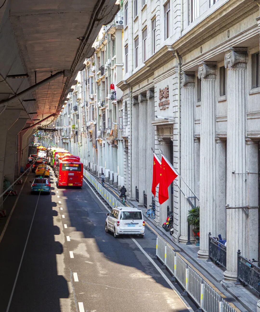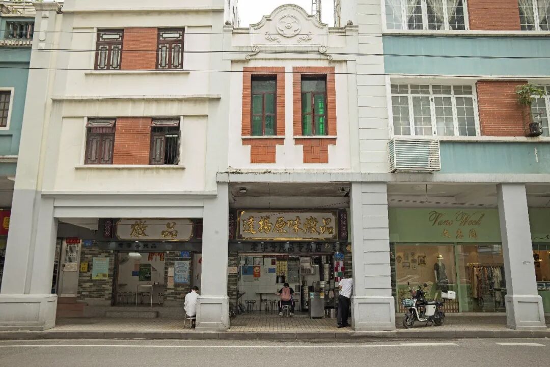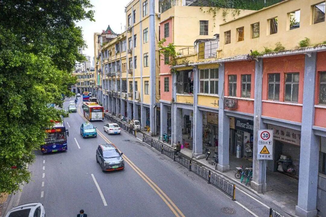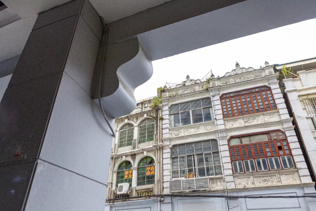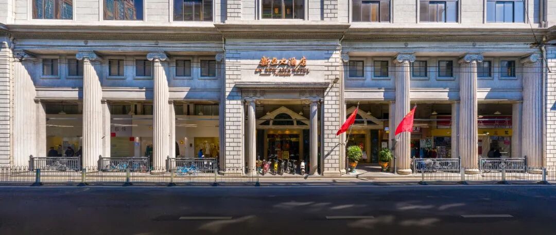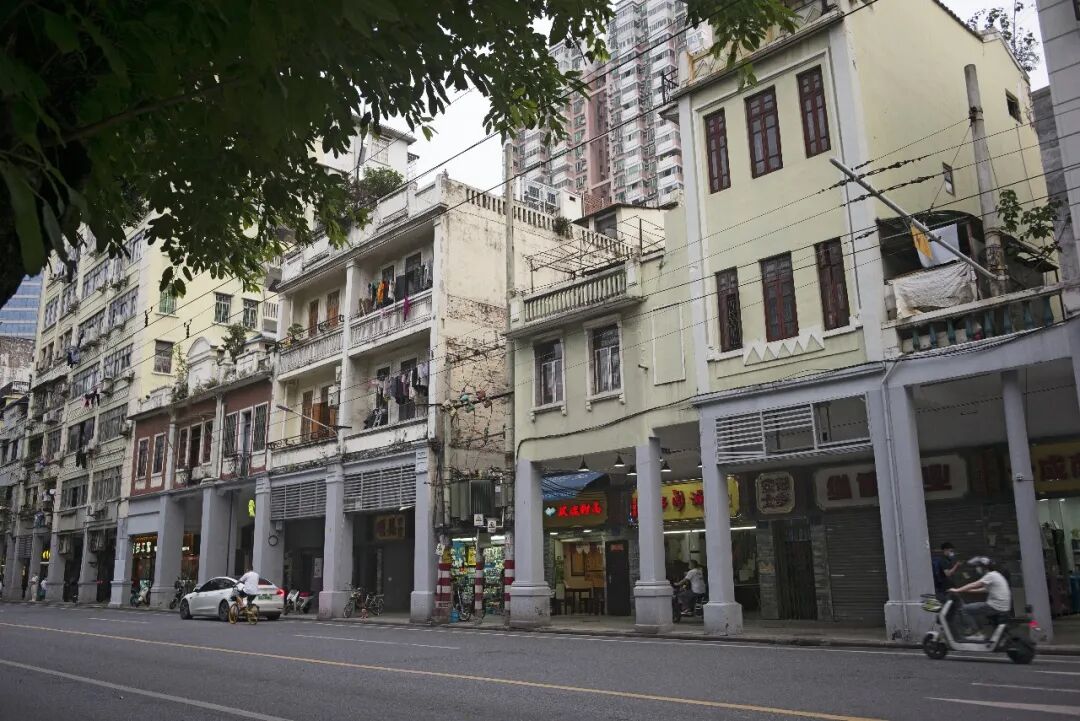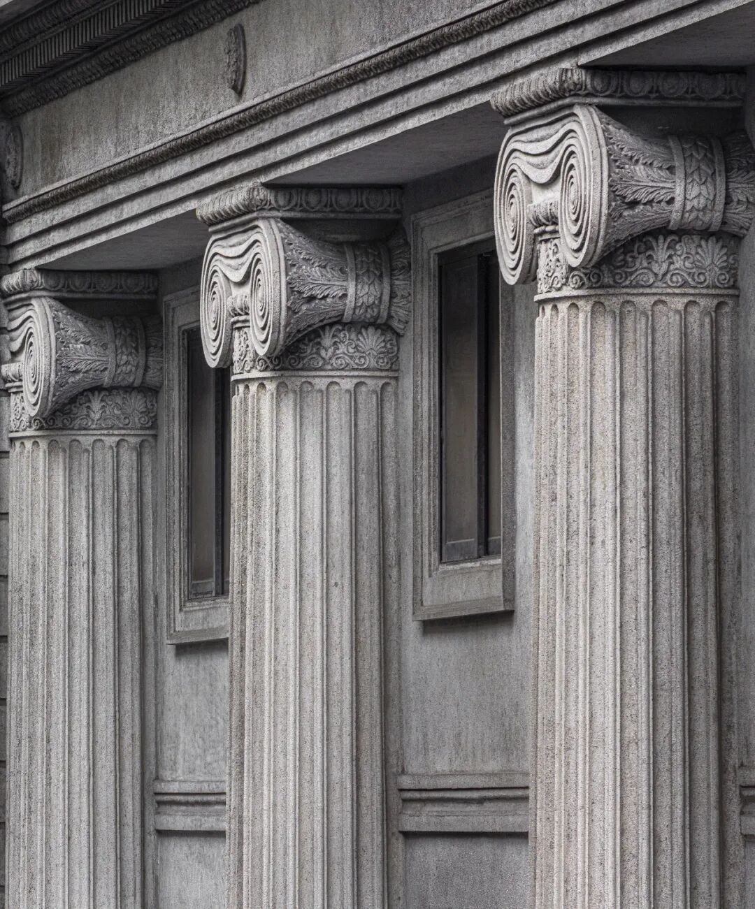 采用连续的古罗马拱券形柱廊跨出行人道上