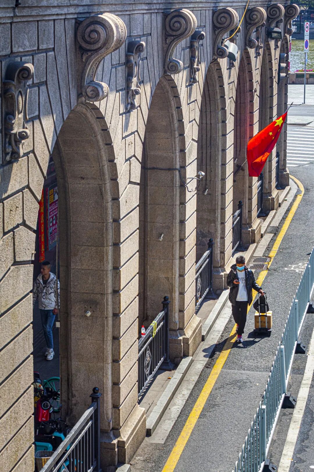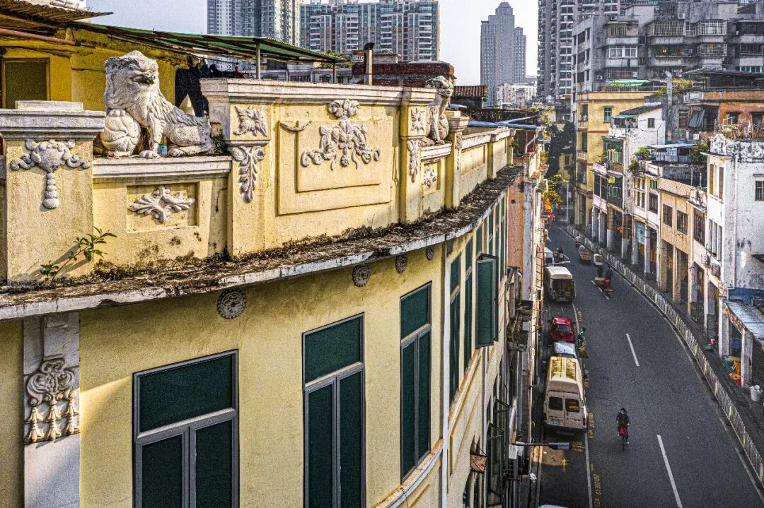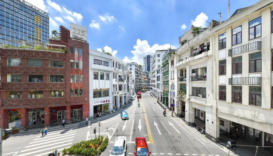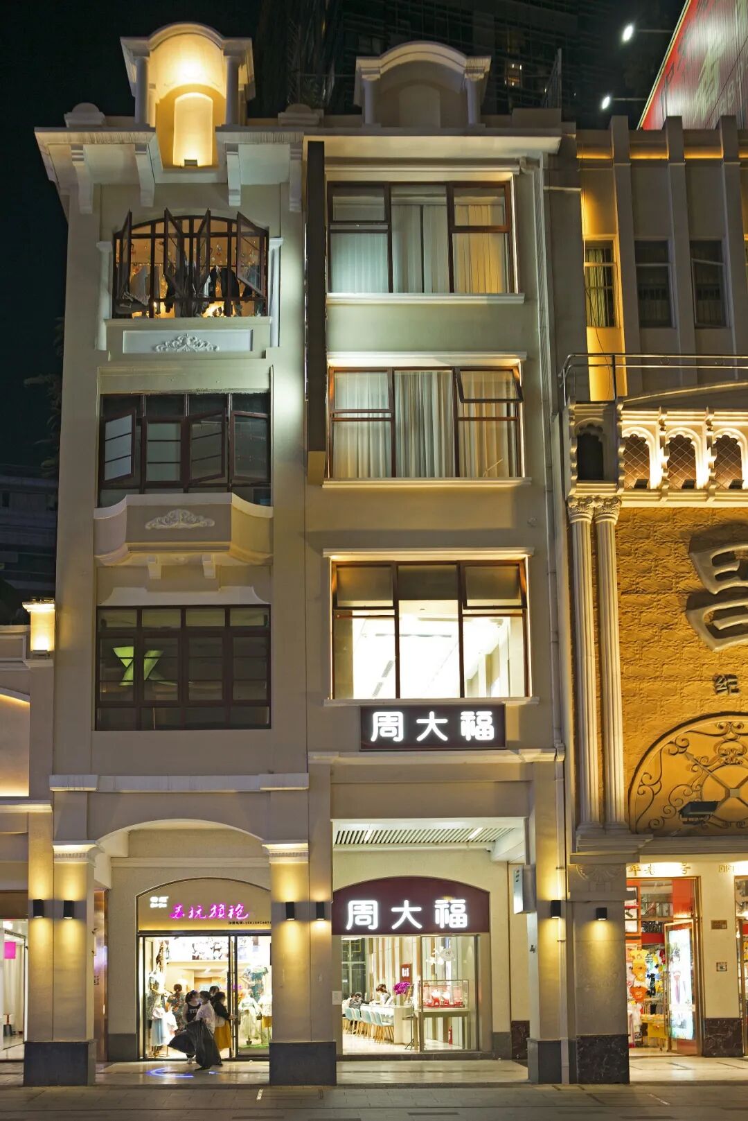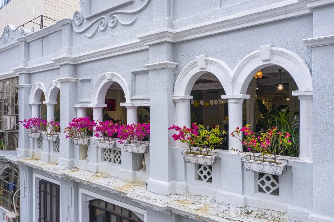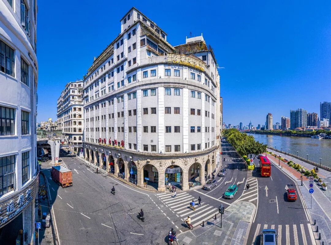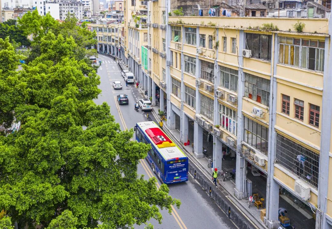 采用连续的古罗马拱券形柱廊跨出行人道上