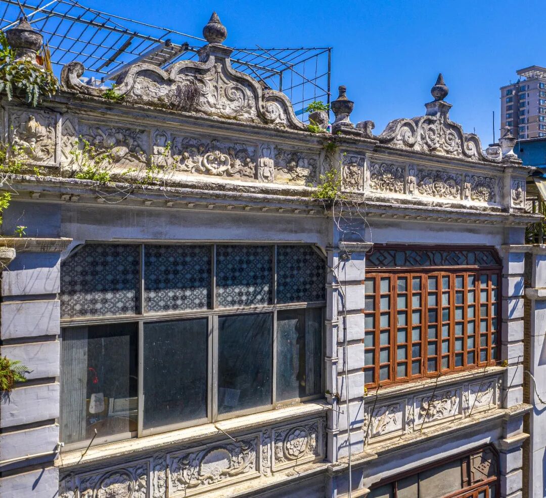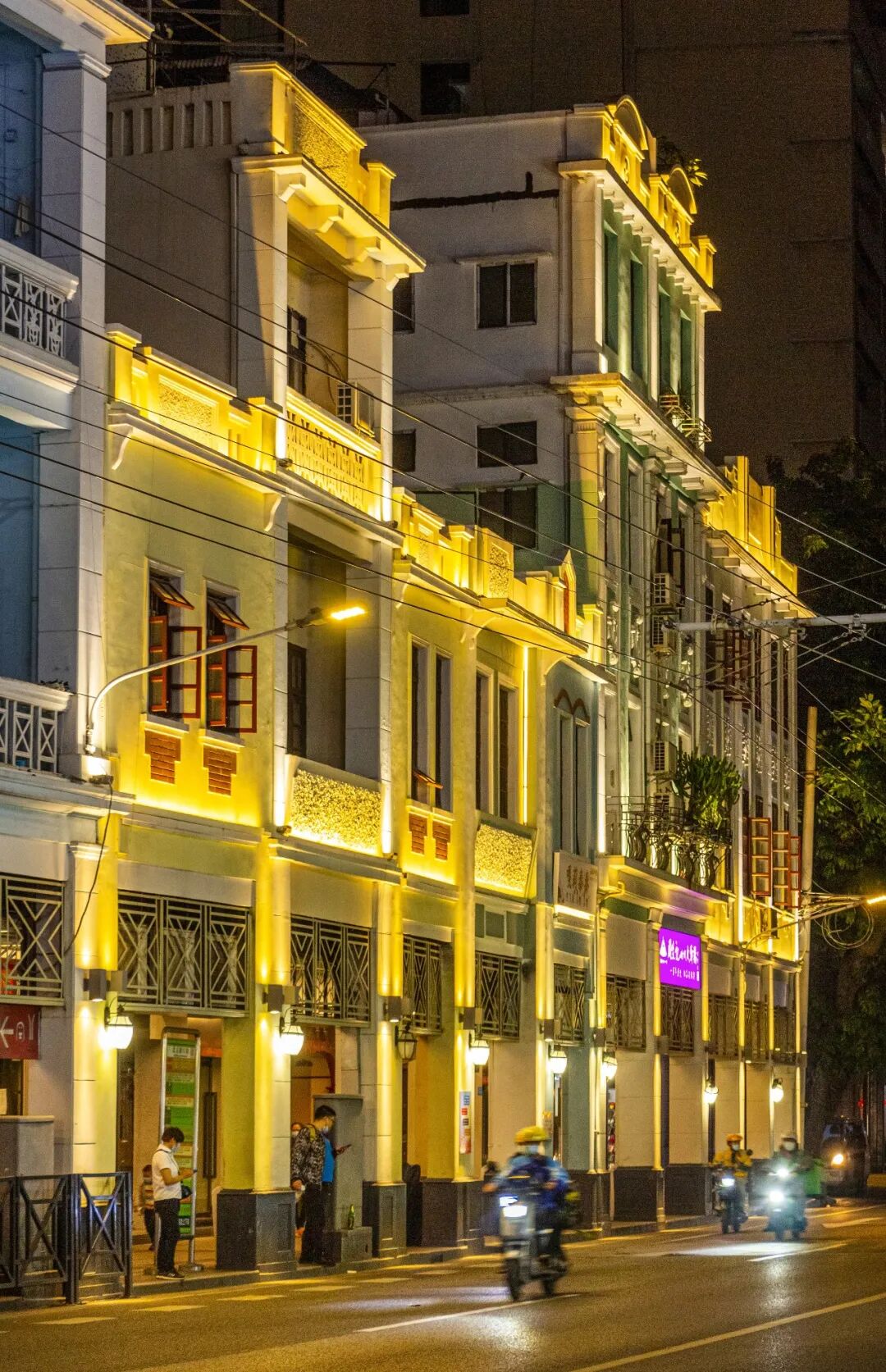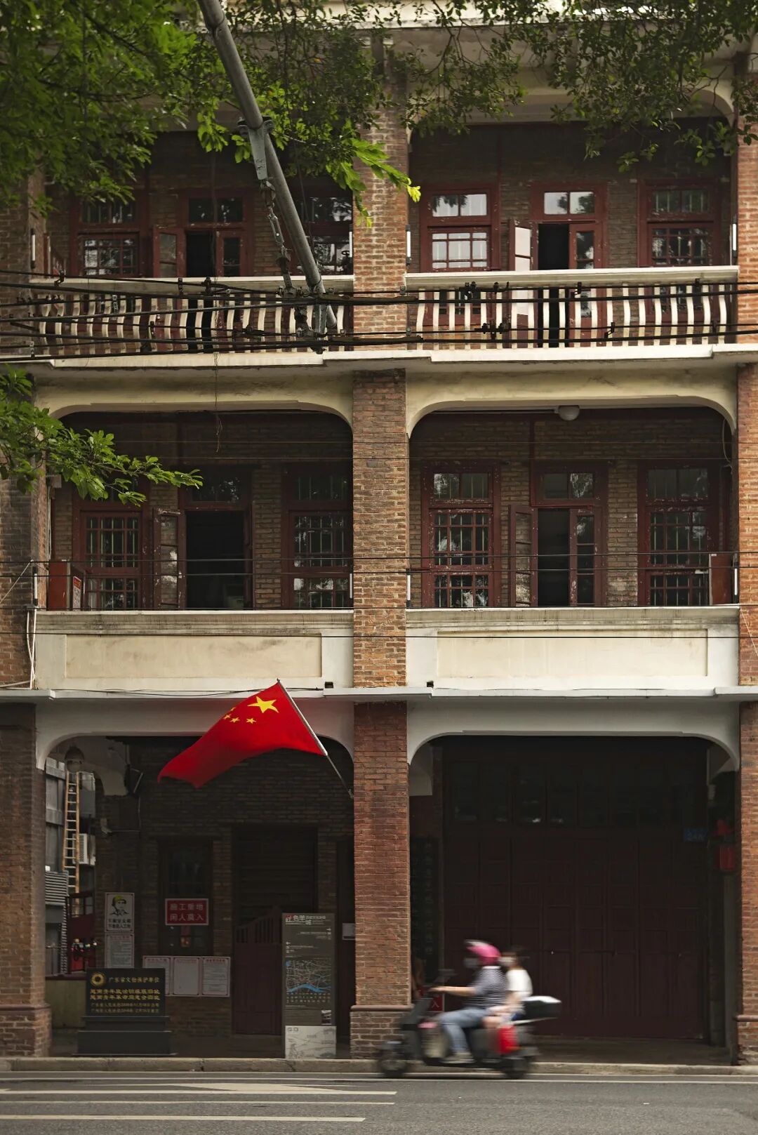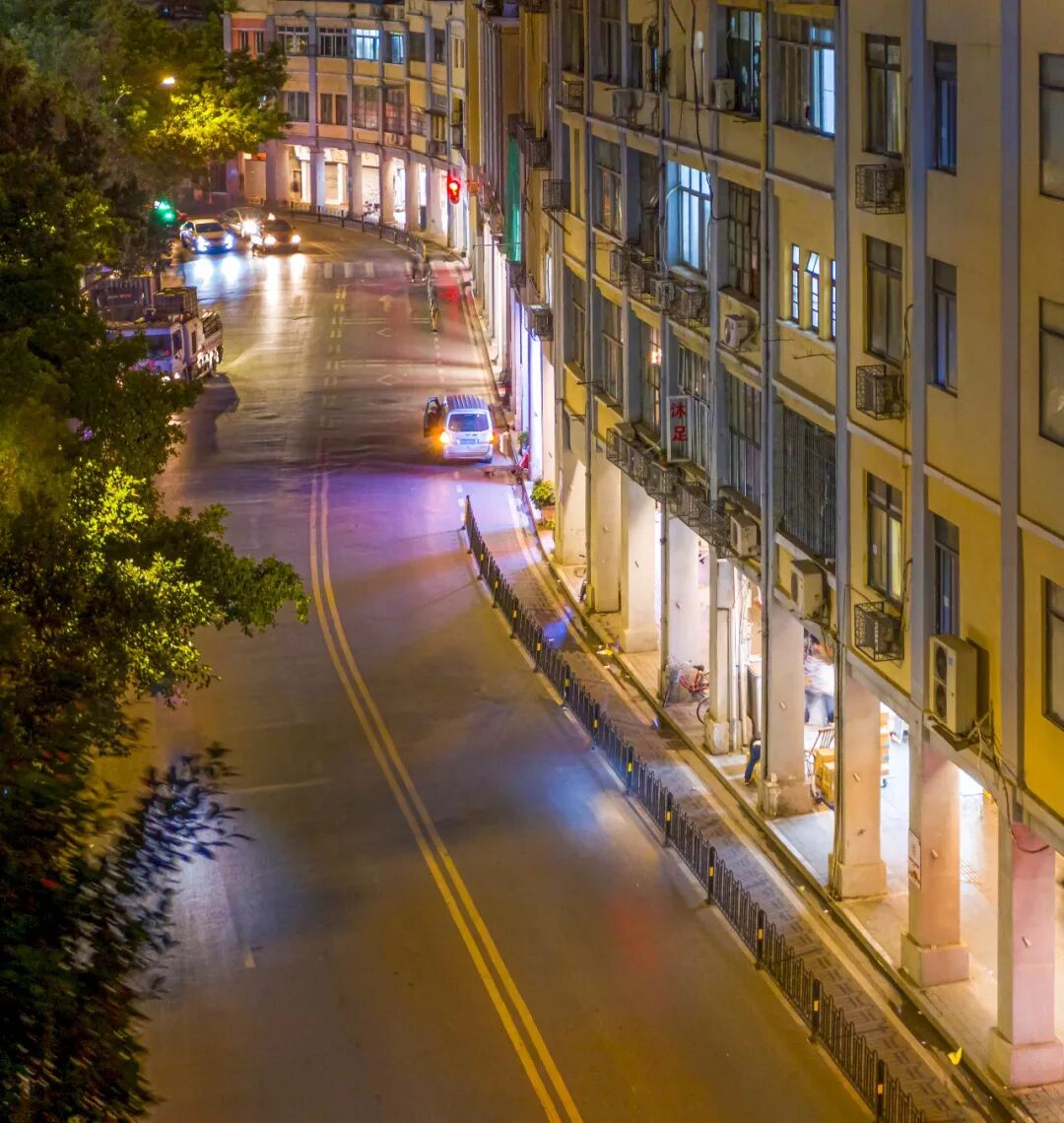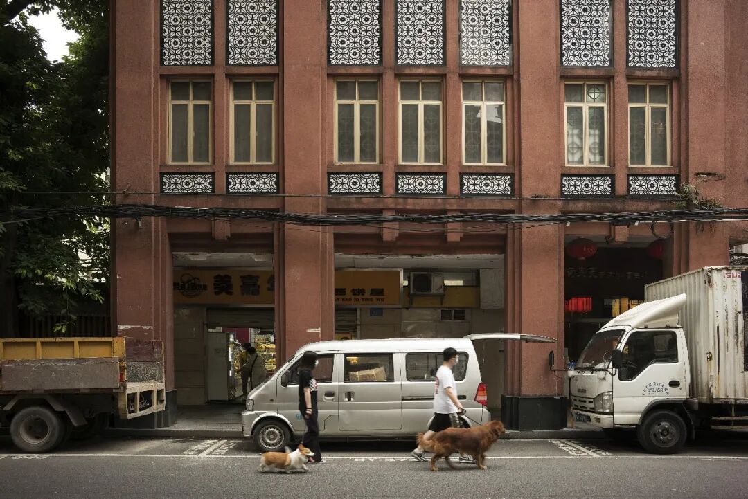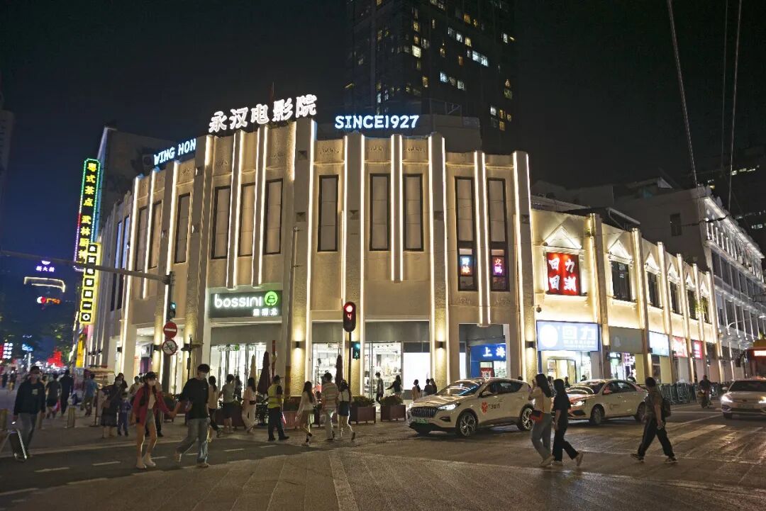 采用连续的古罗马拱券形柱廊跨出行人道上