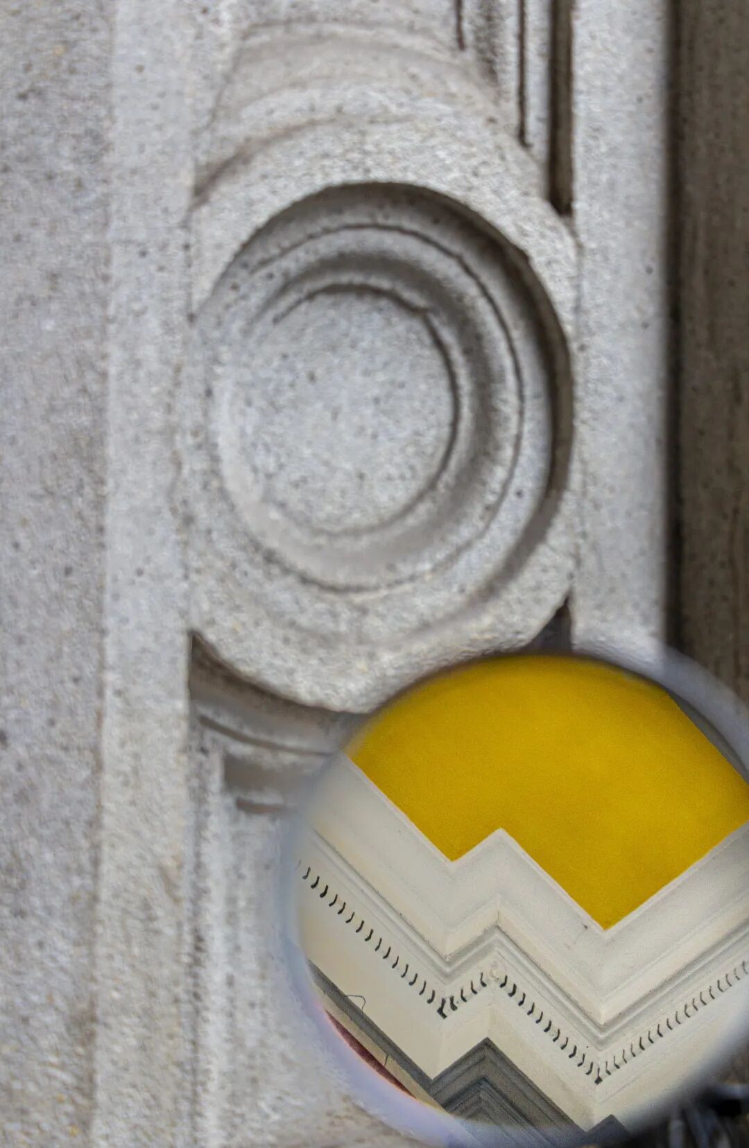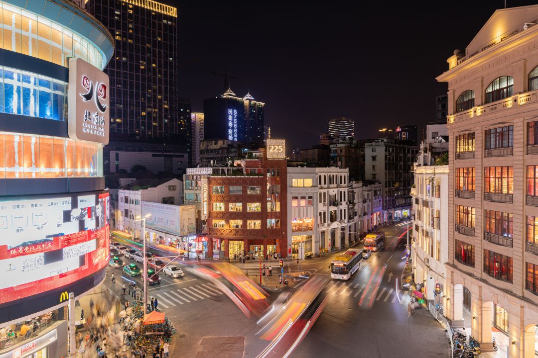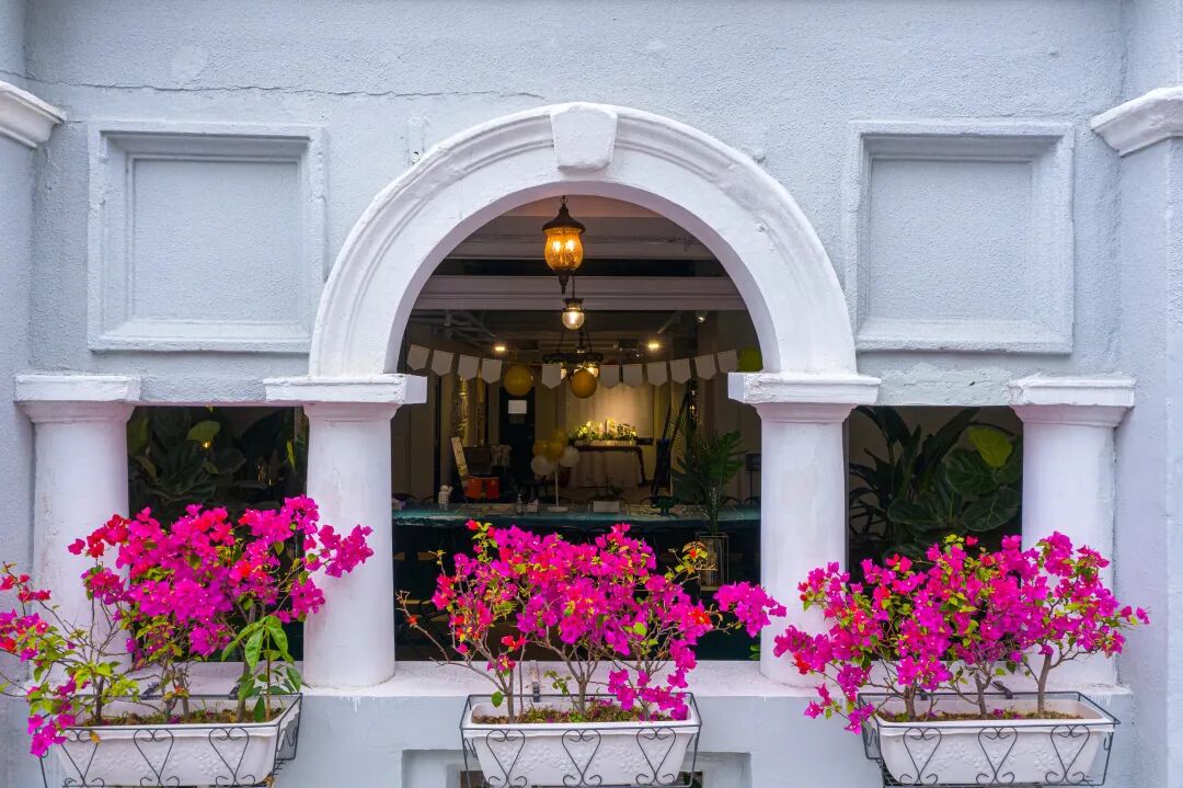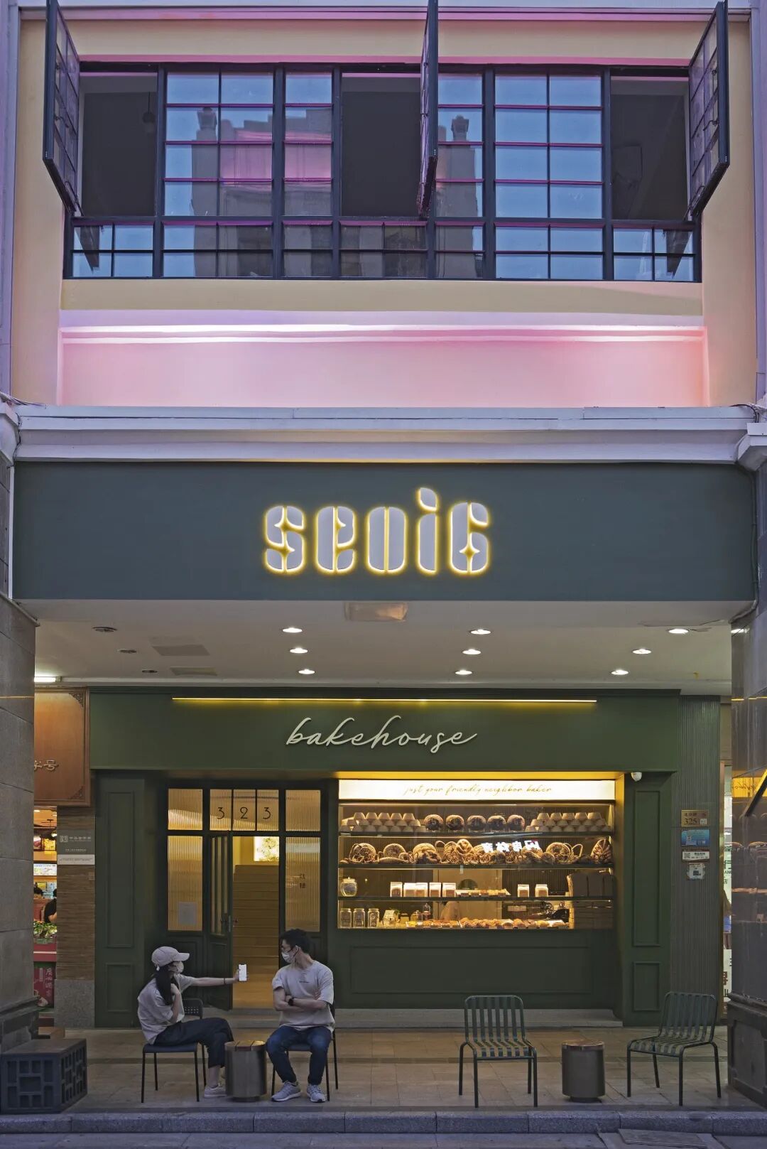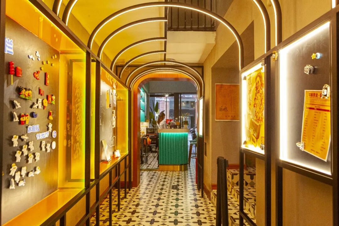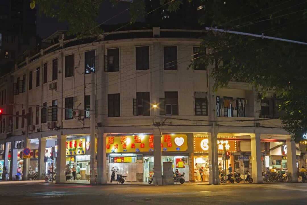 采用连续的古罗马拱券形柱廊跨出行人道上