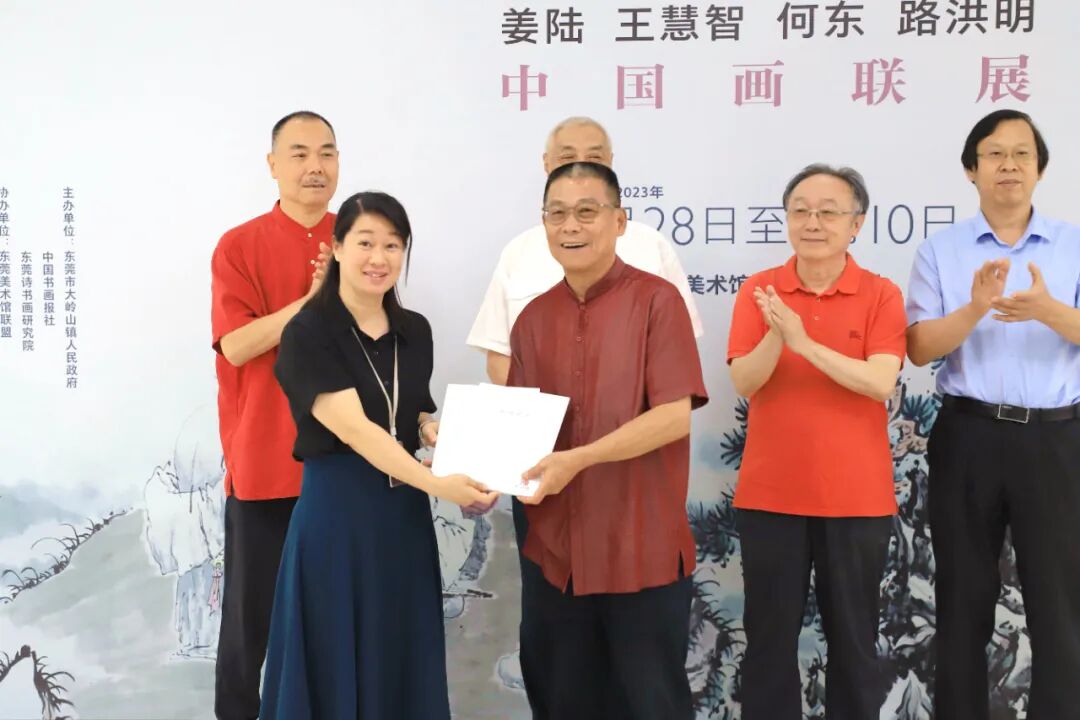 叶晓华代表镇党委、镇政府对本次中国画联展在大岭山的成功举办表示热烈祝贺。他说,中国画的历史源远流长,是中华文化的瑰宝,大岭山将携手艺术家共同谱写好传承、发展与创新“文章”,为东莞打造“文化强市”添砖加瓦。坚持在创作中传承。依托东莞美术馆联盟等平台资源,组织开展更多高水平的经验分享、传帮带等活动,引导广大艺术家潜心向学、专心从艺,在提升创作技艺、打造艺术精品的过程中传承匠心精神。坚持在传承中发展。诚邀艺术家到大岭山走走看看,用手中的画笔和传承的技艺记录城市的发展,通过高雅艺术与乡土文化的有机融合,创作更多展现新时代乡村振兴生动景象的艺术精品。坚持在发展中创新。借东莞打造“七大文化”“四张城市名片”契机,组织开展跨界艺术沙龙等活动,加强艺术家与校企产商的对接,积极推动“潮玩艺术+中国画”融合发展。