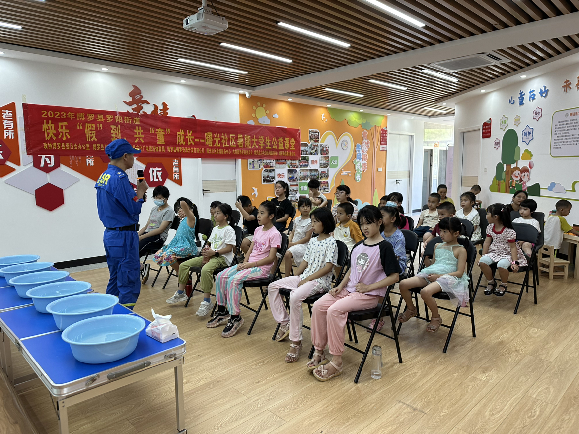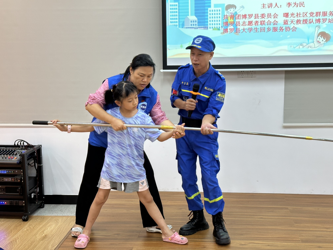 在罗阳街道曙光社区的培训活动现场,蓝天救援队的队员先后向学生讲解了防溺水安全教育知识、溺水救援及现场急救措施,通过讲解、演示救生器材的使用、参与互动等多种形式,向孩子们普及应急避险、自救互救的基本方法和技巧。