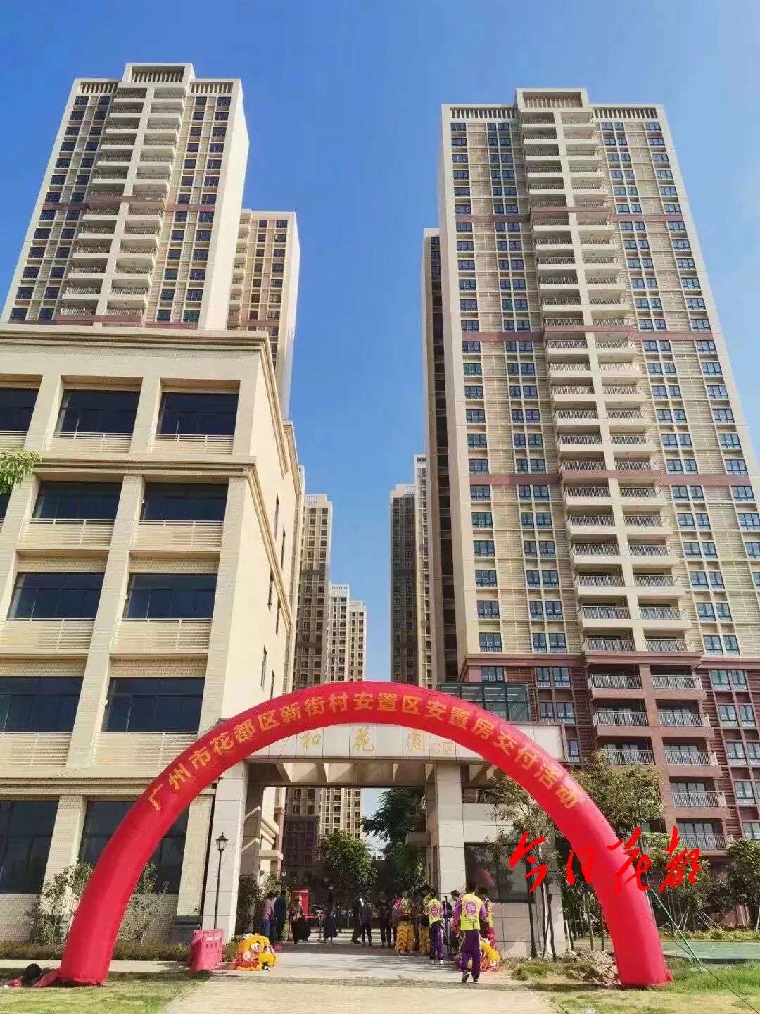 8月8日,在花都区委区政府统一领导下,新华街党工委、新华街道办事处组织实施,新街村党委、村民委员会共同参与,向广州北站综合交通枢纽开发建设项目新街村拆迁安置户交付新街村安置区(地块一、地块三)安置房。