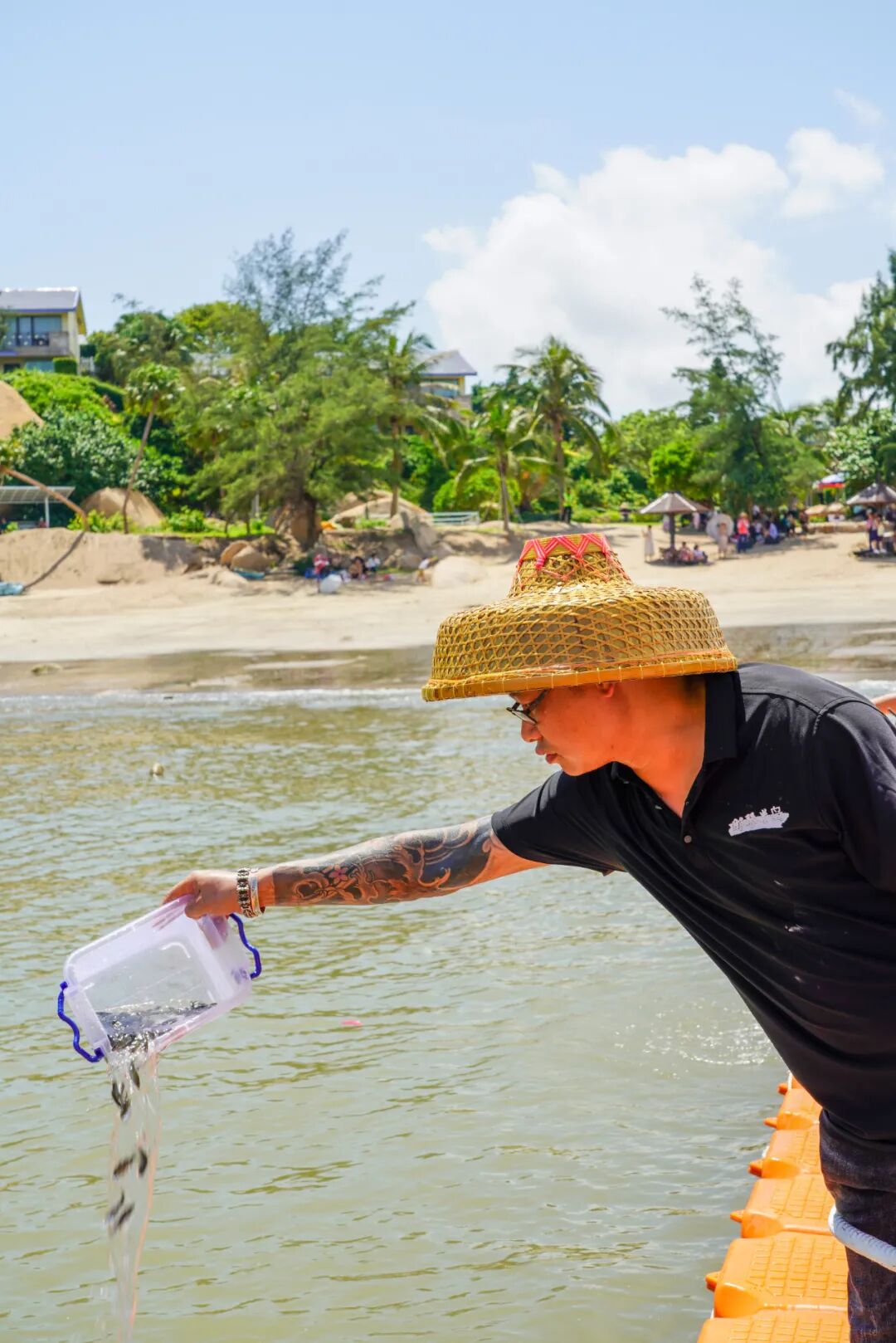 游客与当地渔民,将鱼苗放归大海,