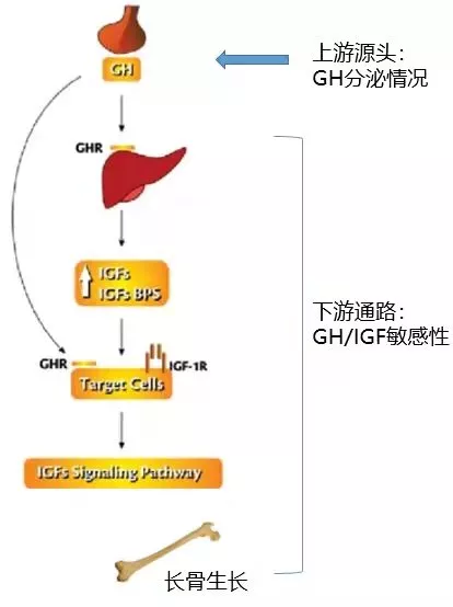 生长激素(GH)/胰岛素样生长因子(IGF)轴是长骨线性生长的重要调控因素,其功能主要由两个因素决定:一是上游源头,即GH分泌情况;二是下游通路,即GH/IGF敏感性。