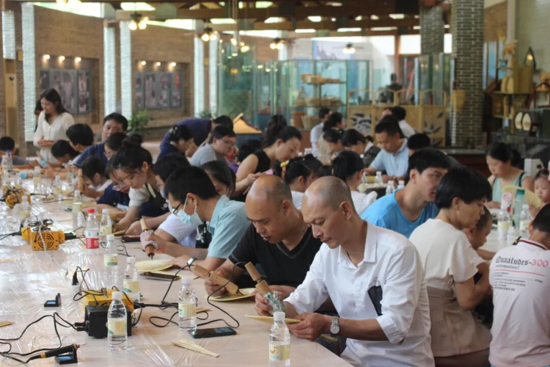 邹美练老师现场讲解了新会葵艺的基础文化并演示了编扇技艺和烙画技艺,参加活动的人员也动手操作体验葵扇制作,完成了一件件制作精美的作品。