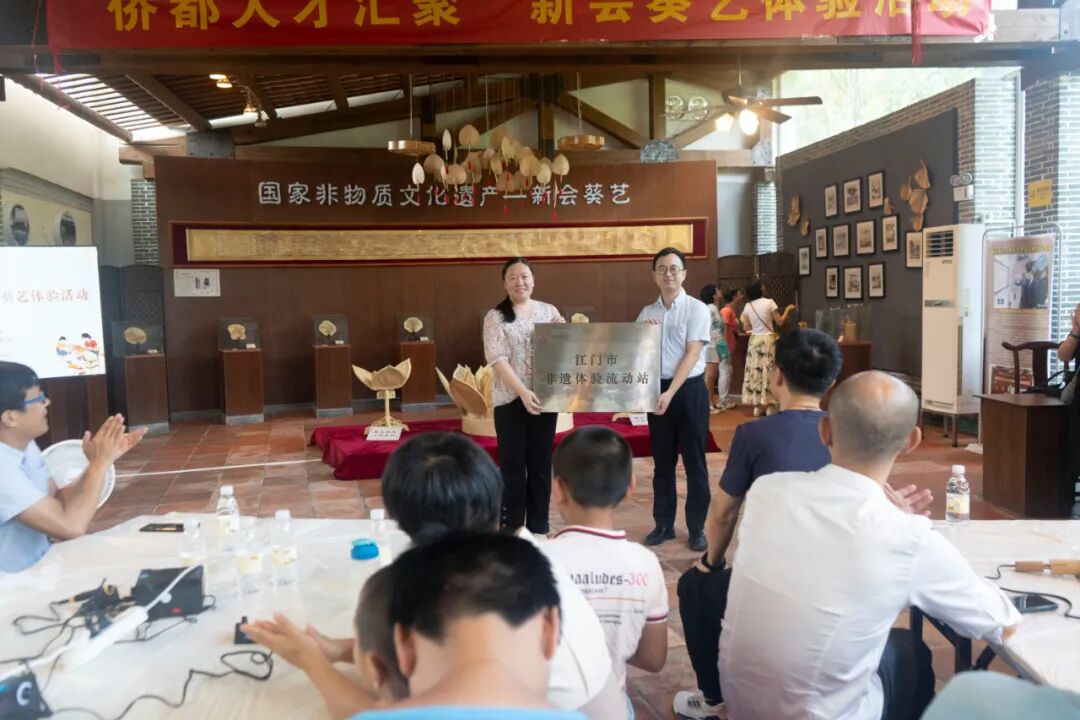 为推进人才服务和传统文化宣传推广融合发展,江门市文化馆馆长苏志向全国博士后创新(江门)示范中心(下称“示范中心”)授予“江门市非遗体验流动站”牌匾,携手推动非遗创造性转化与创新性发展,搭建高层次人才深入了解及体验侨都平台,打造人才文化交流生态圈。