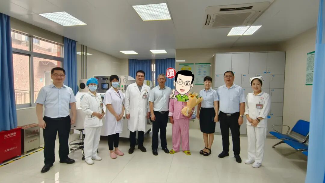 ▲9月12日上午,院领导、医务科、护理部负责人,以及康复医学科医护人员与首位入舱治疗的患者合影。