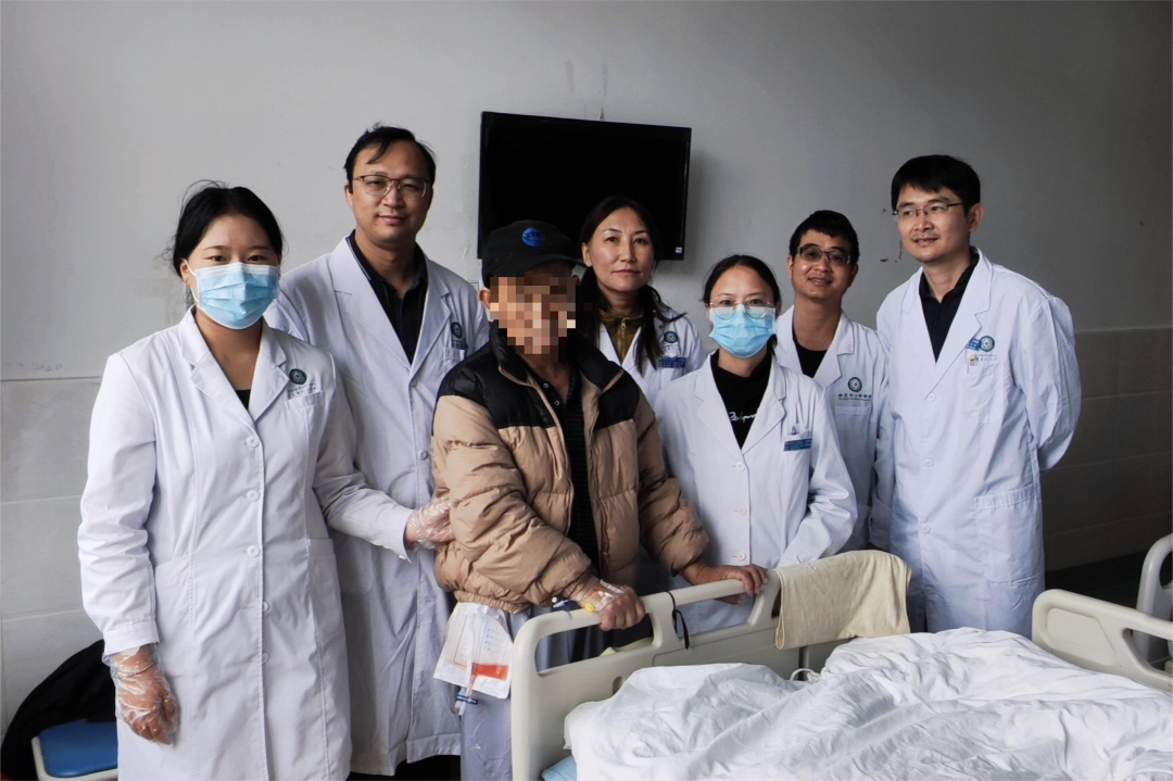▲援藏医疗队医护人员与急性脑卒中患者术后合影