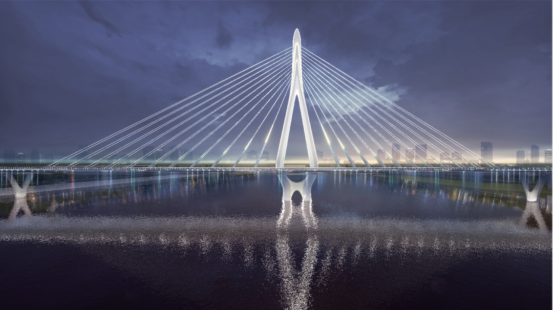 主线东西连接金沙洲和大坦沙岛,分别与佛山建设大道、彩滨南路、大坦沙岛环岛路相交。主桥采用独塔中央索面钢-混组合梁斜拉桥结构,跨径为120+158米,主梁为钢-混凝土组合梁,主塔为钢结构。桥塔造型设计创意象征着广佛两市携手,共同谱写广佛同城新乐章。