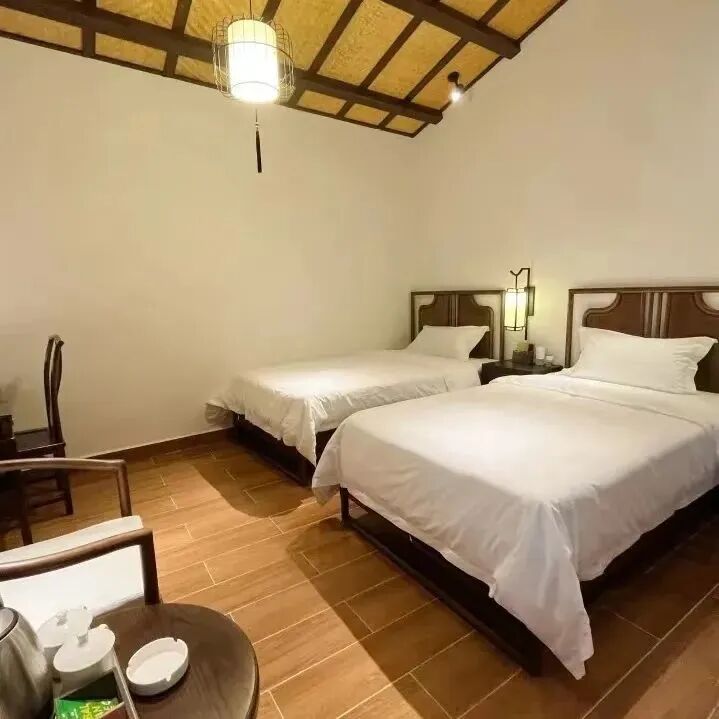房间装扮精致,风格典雅,以木作为空间内的主要元素。木质元素的最大特点是“有温度有感情”。木质茶几,简约的桌椅设计,让长期生活在城市的人能从中体验乡村原始木质感,给人以静谧、简朴而又充满民俗风情的艺术享受。