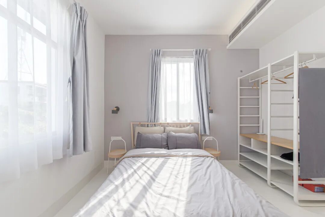 卧室里简约风格的家具凸显休闲之感,温润的原木色增强了空间的亲和力。透过房间内大面积的落地窗便能看到窗外美好的景致,蓝天白云、青青绿植、红红繁花,大自然馈赠的美景犹如挂画。