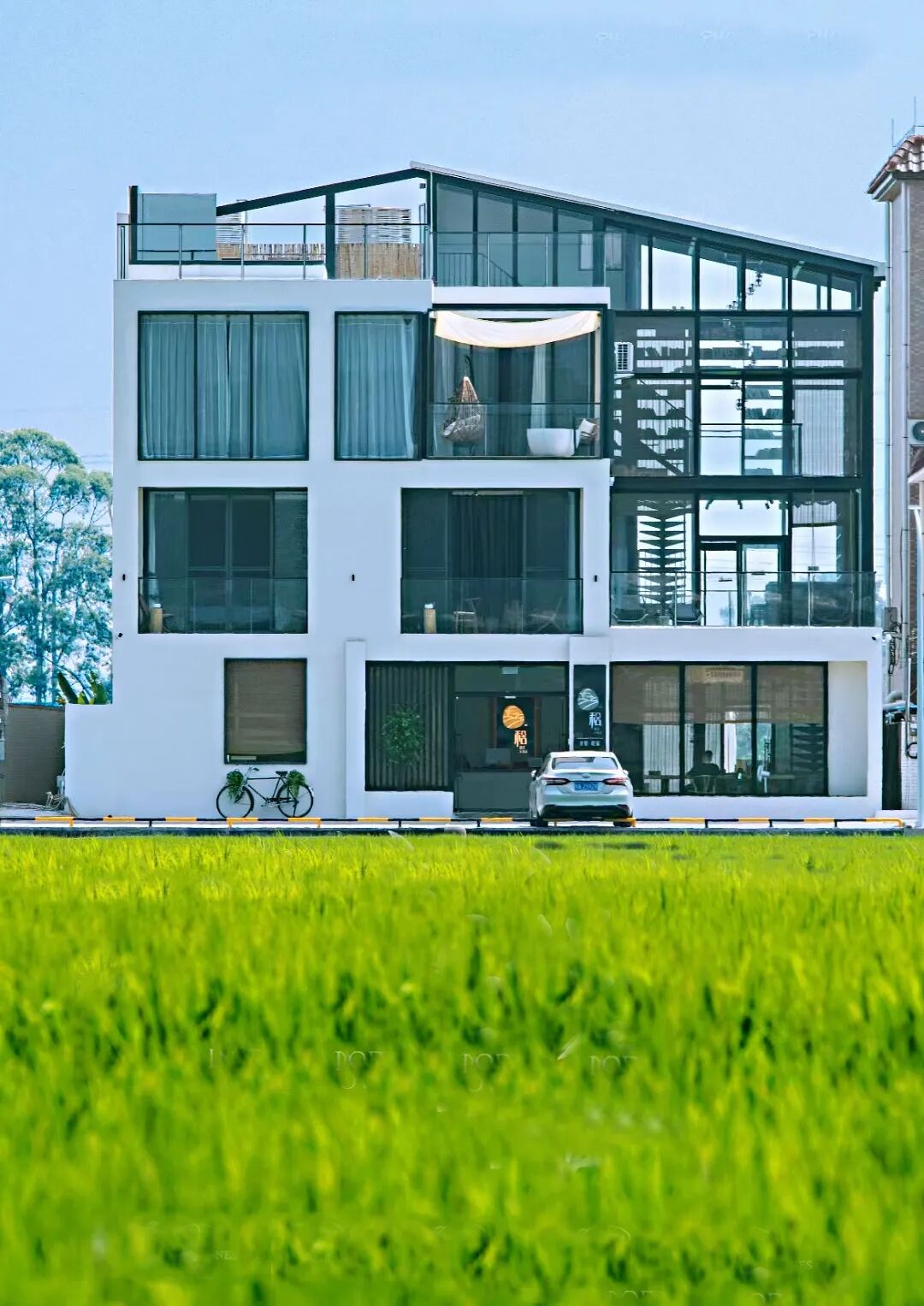 民宿公共空间内,摆放着几千册图书,让客人可以体会耕读之美、田边枕眠;民宿顶楼,特设的网红布景“天空之境”随手一拍即成大片。