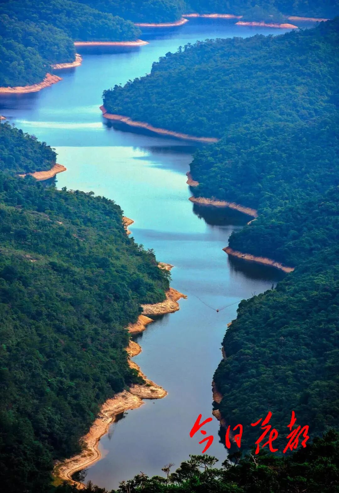 如今,九湾潭水库区域周边成为了国家4A级旅游景区,区内的欧洲风情小镇、欧洲庄园、山顶广场、九龙湖艺术画廊、水上乐园、湖滨公园等项目都成了游客打卡地。这里的人文景观典雅别致,自然和生态环境十分优越,尤其是这九龙湖里的水,每到夏秋季节,湖水像绿宝石一样光彩夺目。